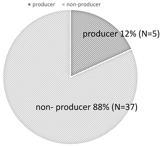 Participants with urinary equol levels of ≥1.0 μM were classified as producers, and those with levels < 1.0 μM as non-producers. Among the 41 participants, the proportion of equol producers was 12.0%, while non-producers accounted for 88.0% (Figure 1). This frequency of equol producers is slightly lower than in previous reports [8], which estimated the prevalence of equol producers at 20%, suggesting that the capacity for equol production may be even lower among women aged 19–20 years.