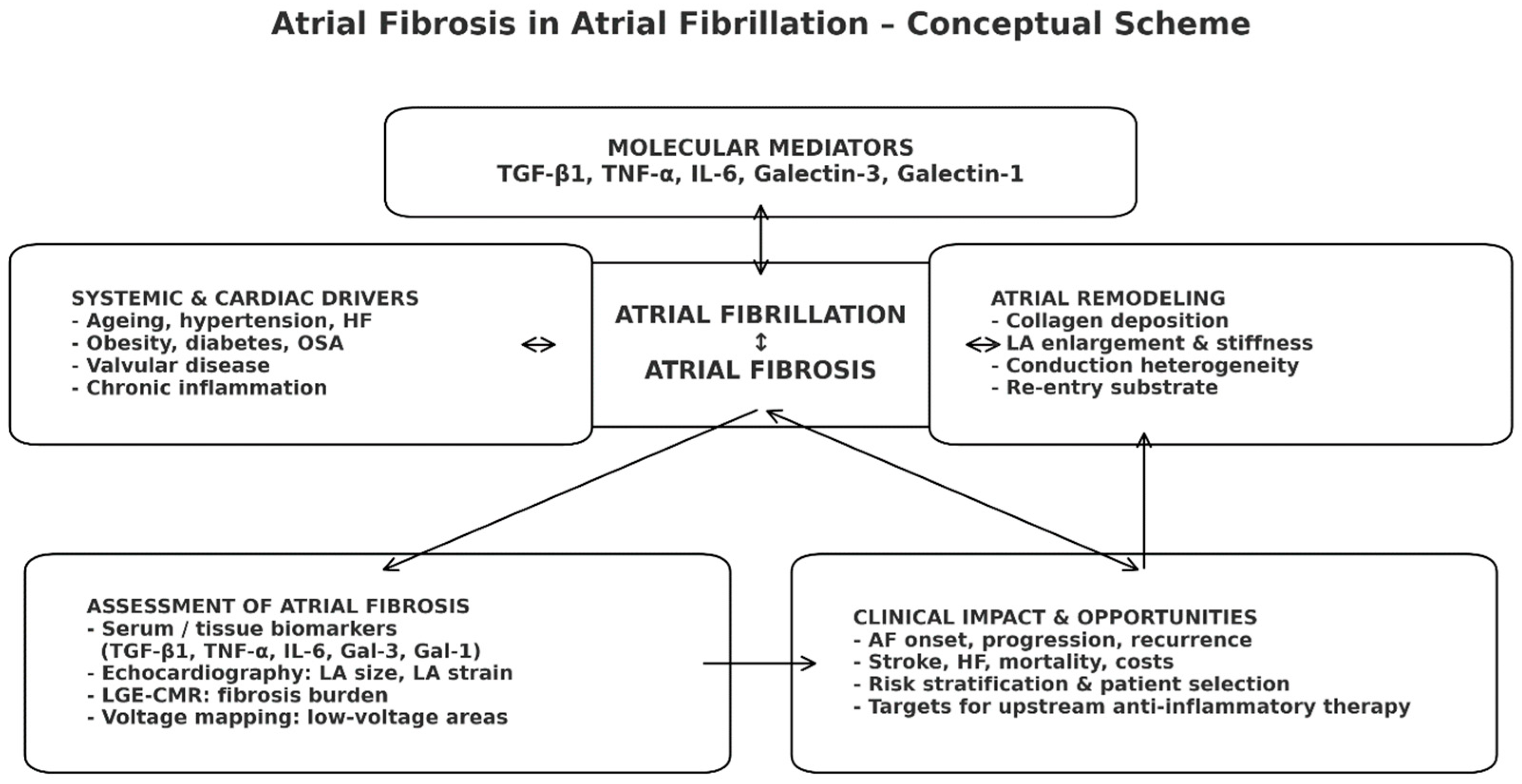 - Pang, Z.; Ren, Y.; Yao, Z. Interactions between Atrial Fibrosis and Inflammation in Atrial Fibrillation. Front. Cardiovasc. Med. 2025, 12, 1578148. [Google Scholar] [CrossRef] [PubMed]