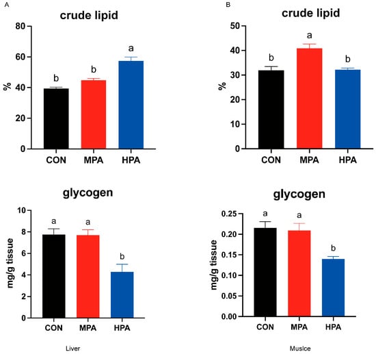 After the experiment, the survival rate of large yellow croaker in all treatment groups was over 90% (91.33 ± 0.67 vs. 93.33 ± 2.40 vs. 90.00 ± 1.15; %), and there was no significant difference between the groups. Given the no significant effects on growth performance by glyceryl palmitate was found [27], the current study concentrated on the impacts on physiological and biochemical responses, especially on the glucose metabolism. As the proportion of glycerin palmitate in the diet increased, the hepatic glycogen content of large yellow croaker exhibited a decreasing trend. Compared to the CON group, the HPA group showed a significant reduction in hepatic glycogen content (p < 0.05, Figure 1A). Similarly, the HPA group’s muscle glycogen content was substantially lower than the CON group’s (p < 0.05, Figure 1B). Furthermore, the HPA group significantly increased hepatic lipid content (p < 0.05, Figure 1A). However, the MPA and CON groups did not significantly differ from one another (p > 0.05, Figure 1A). Regarding muscular lipid content, the MPA group had the highest level, which was significantly greater than those in the CON and HPA groups (p < 0.05, Figure 1B).