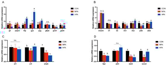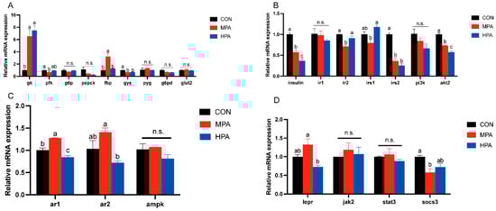 Hepatic gene expression profiles in large yellow croaker fed with different diets (mean ± S.E.M., n = 3). (A) Key enzymes of glucose metabolism and genes related to glucose transport. (B) Genes associated with insulin pathway. (C) Genes associated with adiponectin pathway. (D) Genes associated with leptin pathway. n.s.: no significance. Following Tukey’s test, the same-letter showed no discernible changes across treatments (p > 0.05), while different-letter showed significant changes across treatments (p < 0.05).