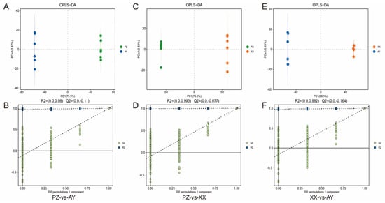 OPLS−DA of the LC/GC–MS data and validation. (A) OPLS−DA of the PZ-vs-AY data. (B) Response permutation testing of PZ-vs-AY data. (C) OPLS−DA of the PZ-vs-XX data. (D) Response permutation testing of PZ-vs-XX data. (E) OPLS−DA of the XX-vs-AY data. (F) Response permutation testing of XX-vs-AY data. R2X (cum): cumulative interpretation rate in the X direction; R2Y (cum): cumulative interpretation rate in the Y direction; Q2 (cum): cumulative forecast rate of the model; R2 and Q2: parameters of the response sequencing test used to measure whether the model was overfitted. XX, Xiangxian; PZ, Pengzhou; AY, Anyue.