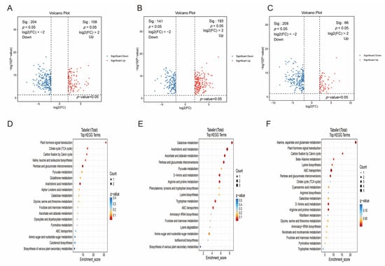 Screening and functional enrichment analysis of DAMs. (A) Volcano plot of DAMs in the PZ vs. AY comparison. (B) Volcano plot of DAMs in the PZ vs. XX comparison. (C) Volcano plot of DAMs in the XX vs. AY comparison. (D) Enriched KEGG pathways of DAMs in the PZ vs. AY group. (E) Enriched KEGG pathways of DAMs in the PZ vs. XX group. (F) Enriched KEGG pathways of DAMs in the XX vs. AY group. DAMs were identified based on VIP ≥ 1, |FC| ≥ 4, and BH-adjusted q-value < 0.05.