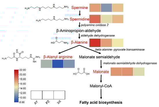 As indicated by the earlier results, DAMs from multiple comparison groups were significantly enriched in the beta-alanine metabolism pathway. Analysis of the metabolites enriched in this pathway revealed a total of five metabolites that showed significant differences among the sample groups. Among them, the contents of spermine, spermidine, and β-alanyl arginine were lower in the PZ samples than in the AY and XX samples. In contrast, the levels of β-alanine and malonate were higher in both AY and PZ samples compared to the XX samples. This pattern may be associated with the higher lipid content observed in the AY and PZ samples (Figure 7).