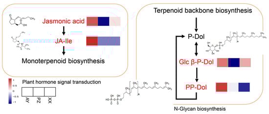Additionally, we found that the Plant hormone signal transduction and N-Glycan biosynthesis pathways were also significantly enriched with DAMs. Within the plant hormone signal transduction pathway, significant enrichment was observed only in the Jasmonate-related hormonal pathway. The abundance of Jasmonic acid was relatively higher in the AY and XX samples and lowest in the PZ samples. Meanwhile, the downstream metabolite JA-Ile exhibited the highest abundance in AY samples and was relatively lower in both PZ and XX samples. This pattern suggests a potential influence on the downstream Monoterpenoid biosynthesis. In the N-Glycan biosynthesis pathway, two metabolites also showed significant abundance variations. Specifically, Glcβ-P-Dol was more abundant in AY and XX samples compared to PZ, whereas PP-Dol reached its highest abundance in AY samples and was lower in both PZ and XX samples. The abundance of metabolites in the N-Glycan biosynthesis pathway is known to depend on key products from the upstream Terpenoid backbone biosynthesis pathway (Figure 8).