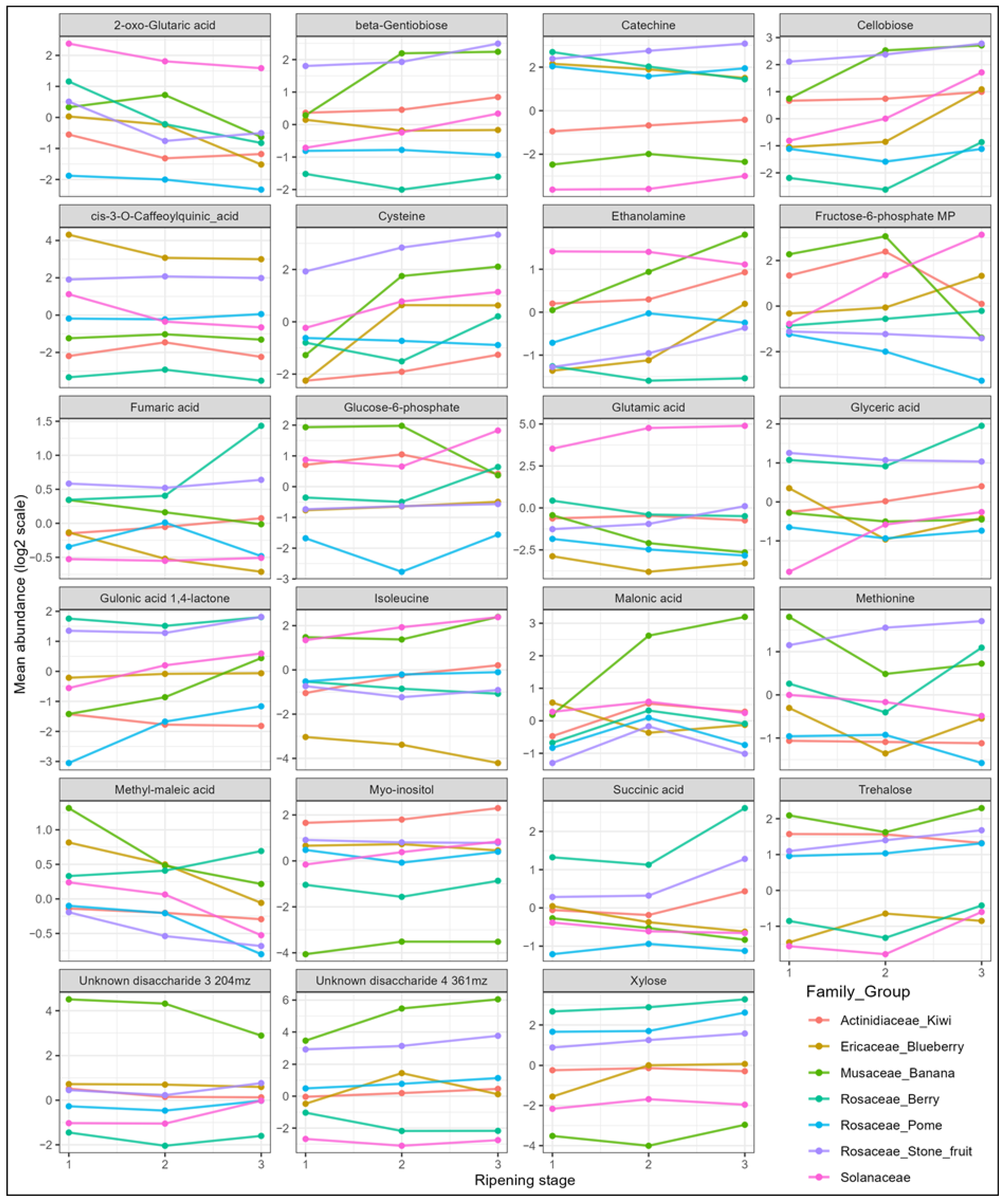 3.3. Linear Trends of Metabolites Across Ripening