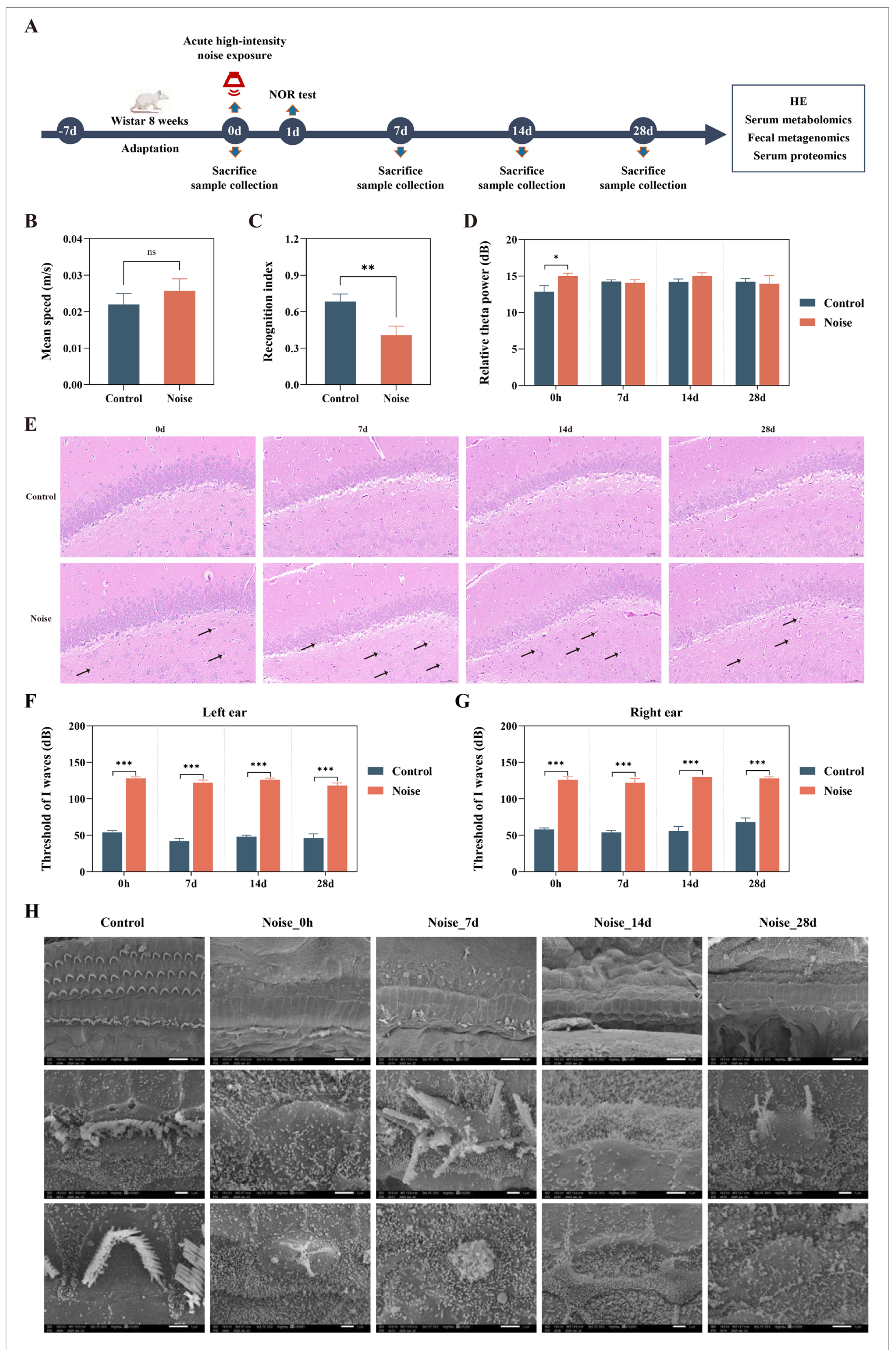 - Li, X.; Fu, B.; Zhao, C.; Hu, J.; Zhang, X.; Fu, Y.; She, X.; Gu, C.; Cheng, M.; Wang, F.; et al. Early-life noise exposure causes cognitive impairment in a sex-dependent manner by disrupting homeostasis of the microbiota-gut-brain axis. Brain Behav. Immun. 2023, 114, 221–239. [Google Scholar] [CrossRef]