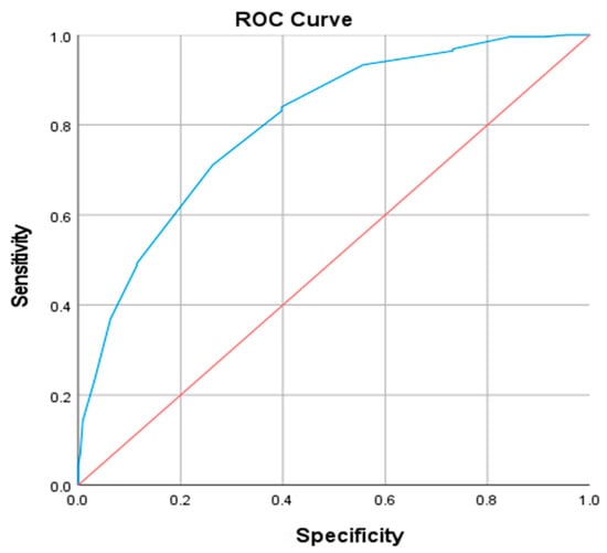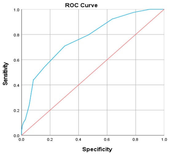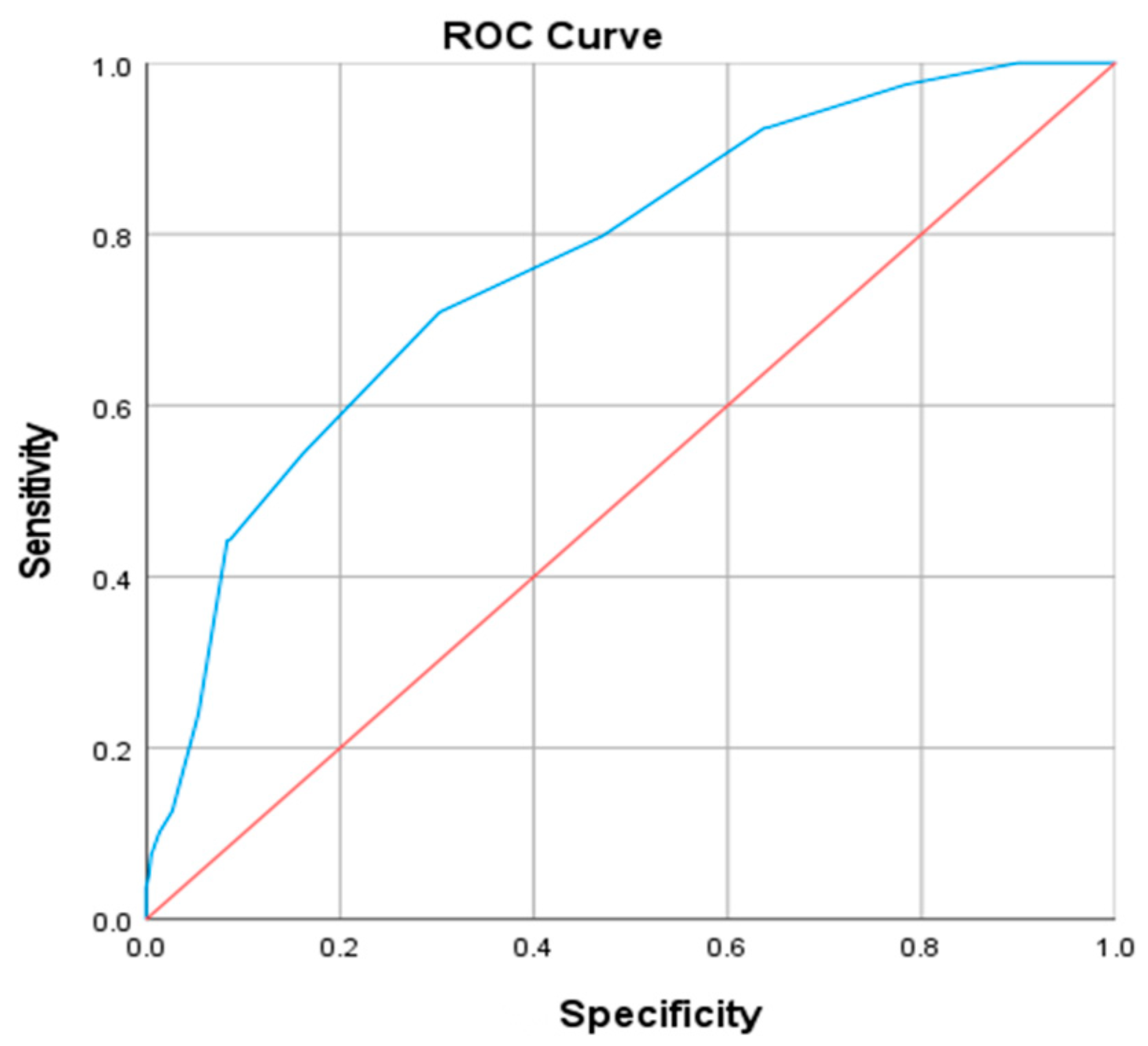 Receiver operating characteristic (ROC) curve analysis was performed to assess the predictive value of NC for VFA abnormality (defined as >100 cm2). For males, the area under the curve (AUC) was 0.802 (p < 0.001). At the optimal cut-off point of 39.5 cm (maximizing the Youden index), sensitivity was 0.711 and specificity was 0.736 (Figure 2). Similarly, in females, the AUC was 0.764 (p < 0.001), with a cut-off value of 35.5 cm yielding a sensitivity of 0.709 and a specificity of 0.692 (Figure 3).