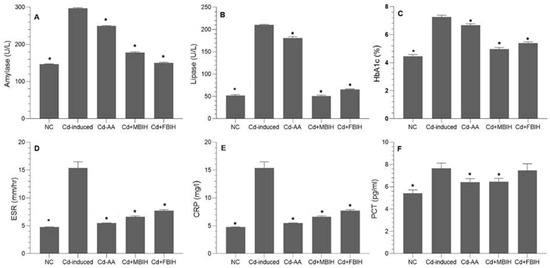 Effects of IAA hydrazone derivatives on pancreatic enzymes, glycemic control, and systemic inflammation in cadmium-exposed rats. (A) Serum amylase activity; (B) serum lipase activity; (C) glycated hemoglobin (HbA1c); (D) erythrocyte sedimentation rate (ESR); (E) C-reactive protein (CRP); and (F) procalcitonin (PCT). Data are presented as mean ± SD. All treatment groups (Cd + AA, Cd + MBIH, Cd + FBIH) were compared to the Cd-induced group by one-way ANOVA, followed by Dunnett’s post hoc test. * Significant values at p ˂ 0.05 when compared with Cd-induced group.