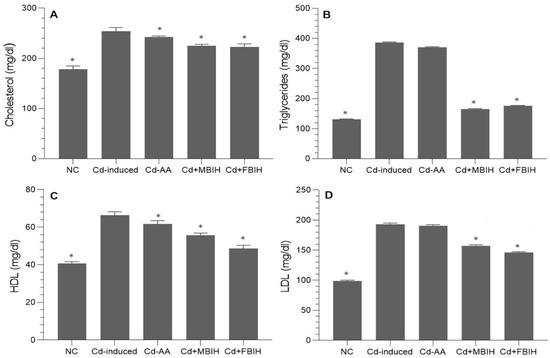 These animals exhibited profound dyslipidemia, indicating a heightened risk of metabolic and cardiovascular complications. Intervention with MBIH and FBIH effectively reversed these alterations, resulting in statistically significant reductions in total cholesterol, TG, and LDL levels (p < 0.001), as illustrated in Figure 3A–D. On the other hand, treatment with ascorbic acid (Cd-AA group) did not produce statistically significant improvements in lipid parameters, suggesting that vitamin C alone has limited efficacy in correcting Cd-induced lipid disturbances.