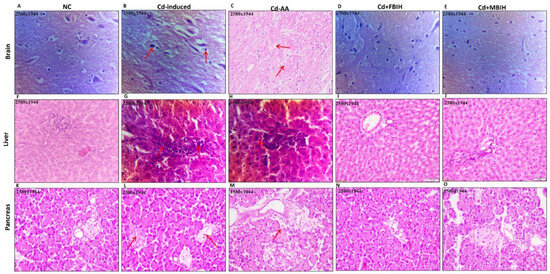 To evaluate cadmium-induced tissue damage and the protective efficacy of MBIH, FBIH, and ascorbic acid, brain, liver, and pancreatic specimens were collected at study end and fixed in 10% neutral-buffered formalin. Samples were processed in a tissue processor through graded ethanol (70%, 95%, and absolute), cleared in a 1:1 xylene–absolute alcohol mixture, and embedded in molten paraffin wax at 60 °C. Five-micrometer sections were cut, mounted on glass slides, and stained with hematoxylin and eosin. Histopathological changes were examined under a light microscope at 40× magnification, and representative photomicrographs (2580 × 1944 pixels) were captured to document morphological alterations across treatment groups.