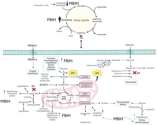 Metabolomics, defined as “the quantitative measurement of the dynamic multiparametric metabolic response of living systems to pathophysiological stimuli or genetic modifications” [13], enables comprehensive profiling of metabolites in cells, tissues, organs, and biofluids [14]. By analyzing these small molecule signatures, metabolomics offers a detailed snapshot of an organism’s biochemical status under various physiological and pathological conditions [15]. This approach has proven invaluable for elucidating disease mechanisms, discovering diagnostic and prognostic biomarkers, and evaluating toxicological responses [16]. In particular, metabolomic techniques are increasingly applied in drug development and food safety assessment [17]. For example, 18. Ilyas et al. (2024) employed ultra-performance liquid chromatography–mass spectrometry (UPLC–MS) to characterize the biochemical impact of acephate exposure in rats, revealing neurotoxicity, hepatic dysfunction, oxidative stress, and disruptions in lipid and amino acid metabolism [18]. Owing to the difficulty of evaluating long-term health consequences of chronic, low-level cadmium exposure at the whole-organism scale, metabolomics provides a powerful approach for identifying toxic metal-induced metabolic disruptions and adaptive responses [13,19].