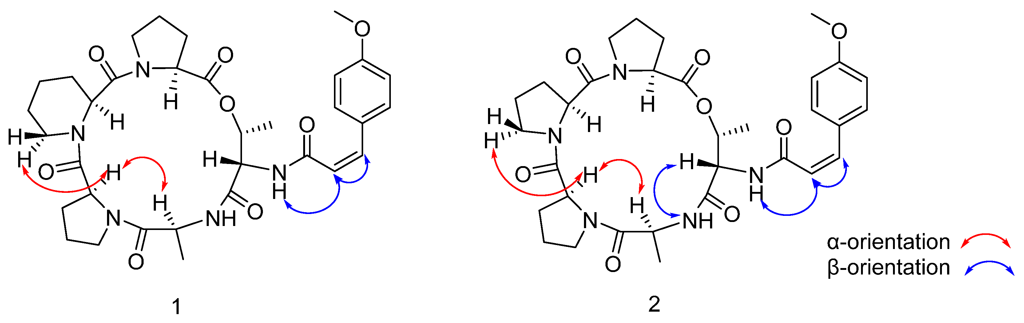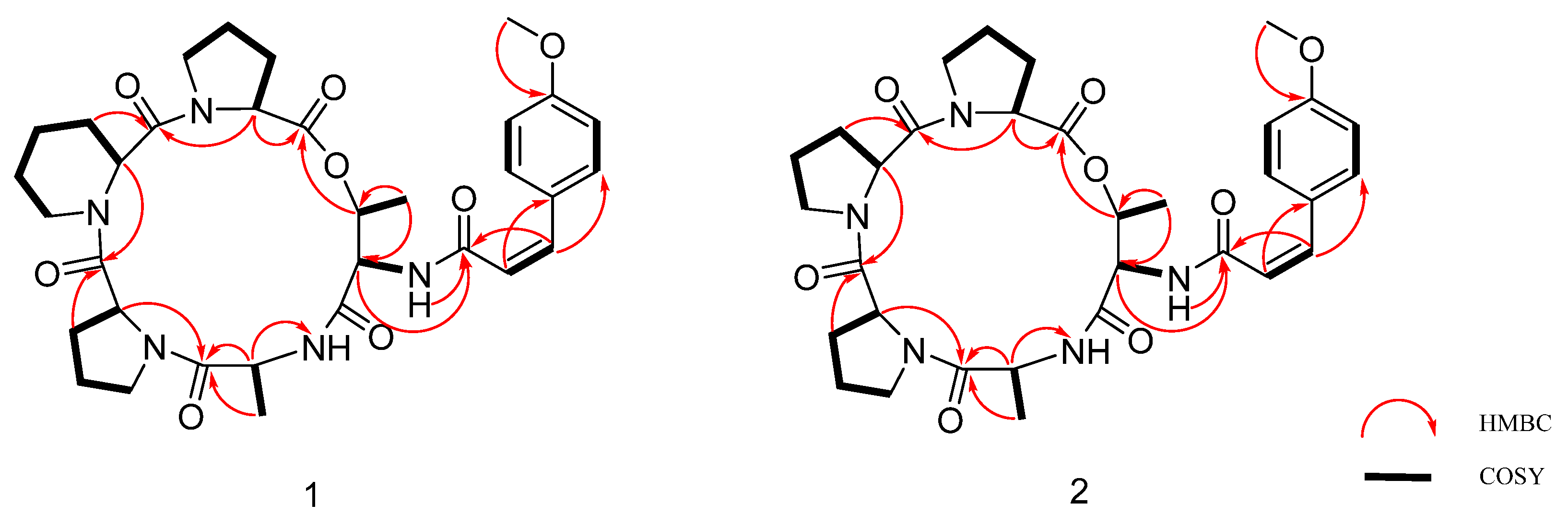 - Chi, L.-P.; Liu, D.; Li, X.-M.; Wan, Y.; Wang, B.-G.; Li, X. Aspertides A–E: Antimicrobial Pentadepsipeptides with a Unique p-Methoxycinnamoyl Amide Group from the Marine Isolates Aspergillus tamarii MA-21 and Aspergillus insuetus SD-512. J. Agric. Food Chem. 2023, 71, 13316–13324. [Google Scholar] [CrossRef]