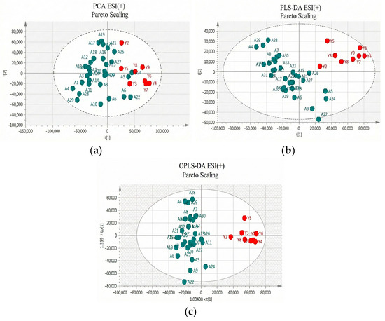 (a) PCA score plot in Pareto scaling with R2 = 0.610, Q2 = 0.364, and 5 principal components; (b) PLS-DA score plot in Pareto scaling with R2 = 0.853, Q2 = 0.601, and 2 principal components; and (c) OPLS-DA score plot in Pareto scaling with R2 = 0.913, Q2 = 0.715, and 3 principal components for UHPLC-MS serum analysis in positive ionization ESI (+) between controls (red) and patients (green).