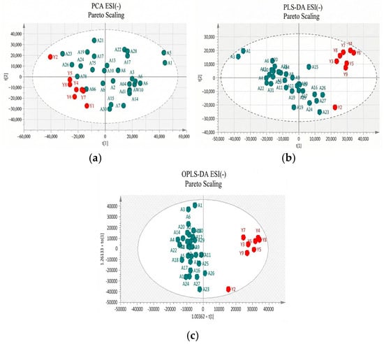 Two approaches were adopted for data scaling: UV (auto-scaling) and Pareto scaling for both negative and positive ion modes. UV scaling equalizes the importance of all metabolites but amplifies baseline noise. Conversely, Pareto scaling retains the original measurements to a greater extent but is responsive to significant changes [20]. As depicted in Figure 2 and Figure 3 for positive and negative ion modes, respectively, the samples showed close clustering in PCA score plots. However, the distinction between the two groups was not deemed satisfactory, and therefore supervised methods, such as PLS-DA or OPLS-DA, were employed.