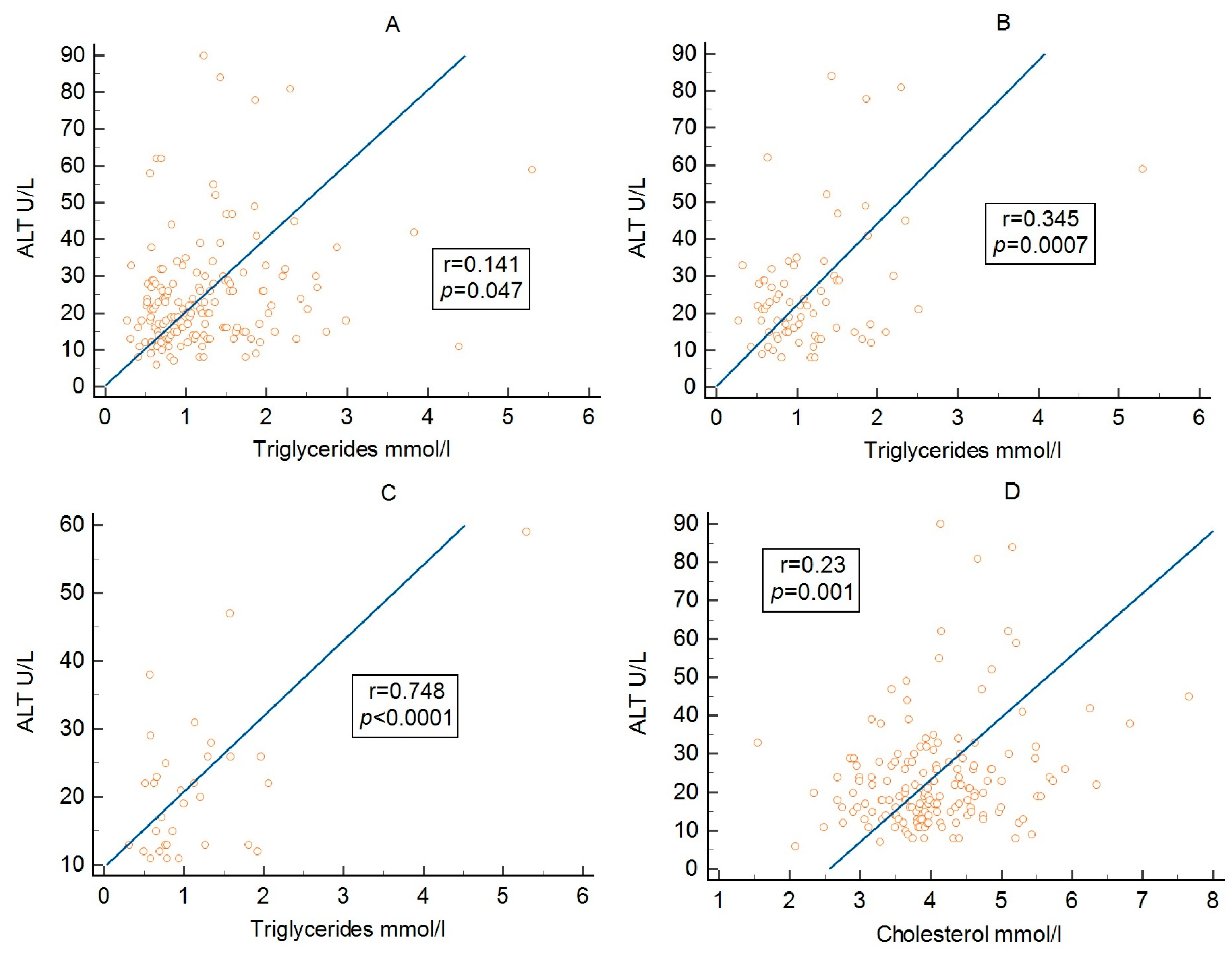 | ALT/triglycerides | 0.24 (0.07–0.4), p = 0.0071 | 0.42 (0.237–0.575), p < 0.0001 | 0.09 (−0.15–0.33), p = 0.45 | 0.7 (0.506–0.831), p = 0.006 | 0.15 (−0.23–0.49), p = 0.43 |