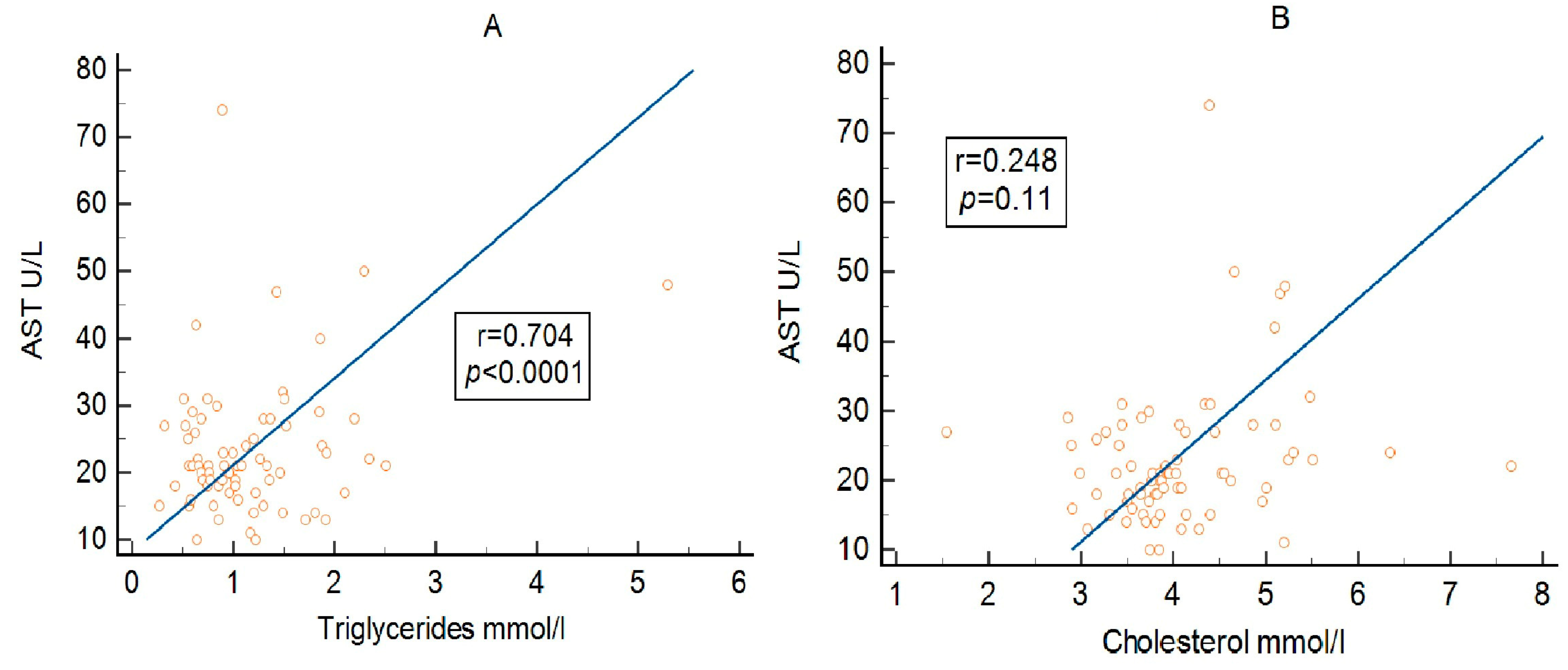| AST/triglycerides | 0.14 (0.001–0.275), p = 0.04 | 0.34 (0.15–0.51), p = 0.0007 | −0.11 (−0.29–0.08), p = 0.25 | 0.74 (0.57–0.85), p < 0.0001 | −0.02 (−0.29–0.24), p = 0.83 |