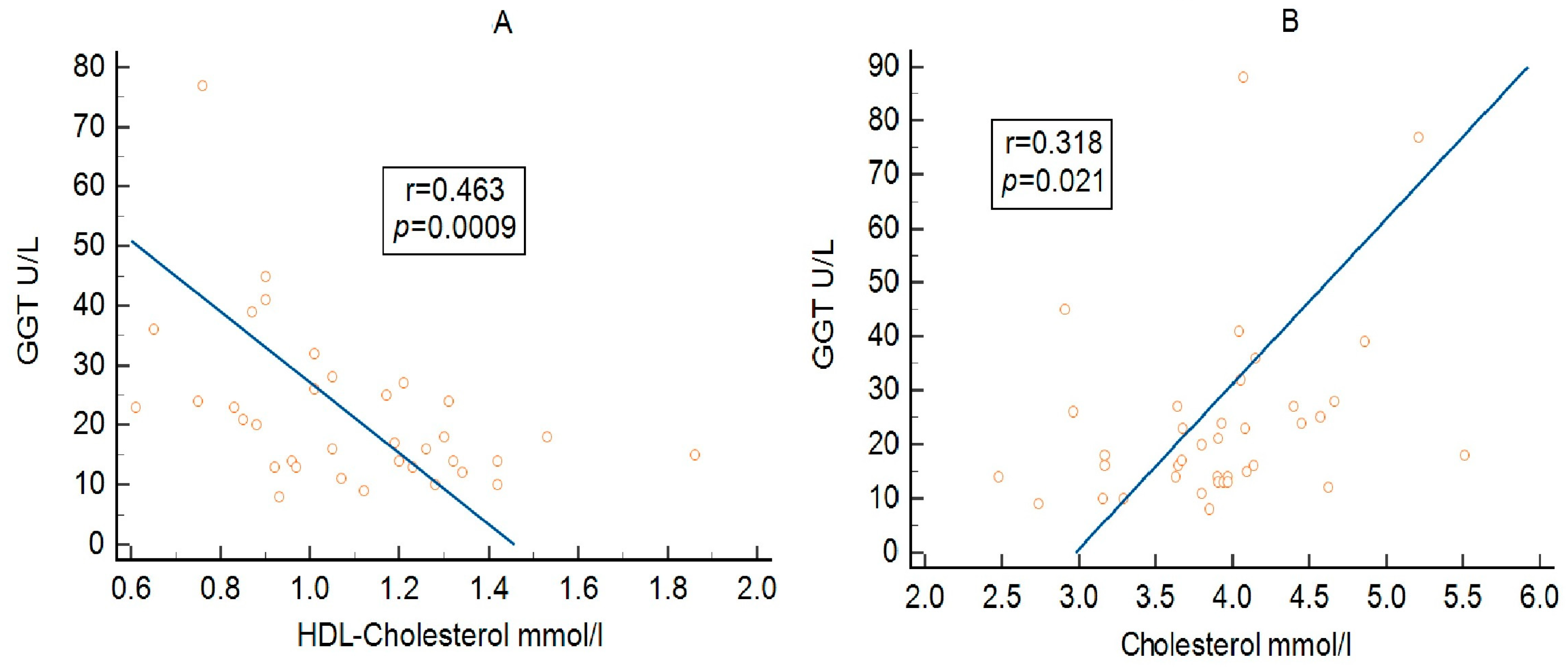 | GGT/cholesterol | 0.31 (0.−4–0.54), p = 0.021 | 0.29 (−0.11–0.61), p = 0.15 | 0.35 (−0.03–0.64), p = 0.071 | 0.56 (0.16–0.8), p = 0.0096 | 0.25 (−0.25–0.65), p = 0.32 |