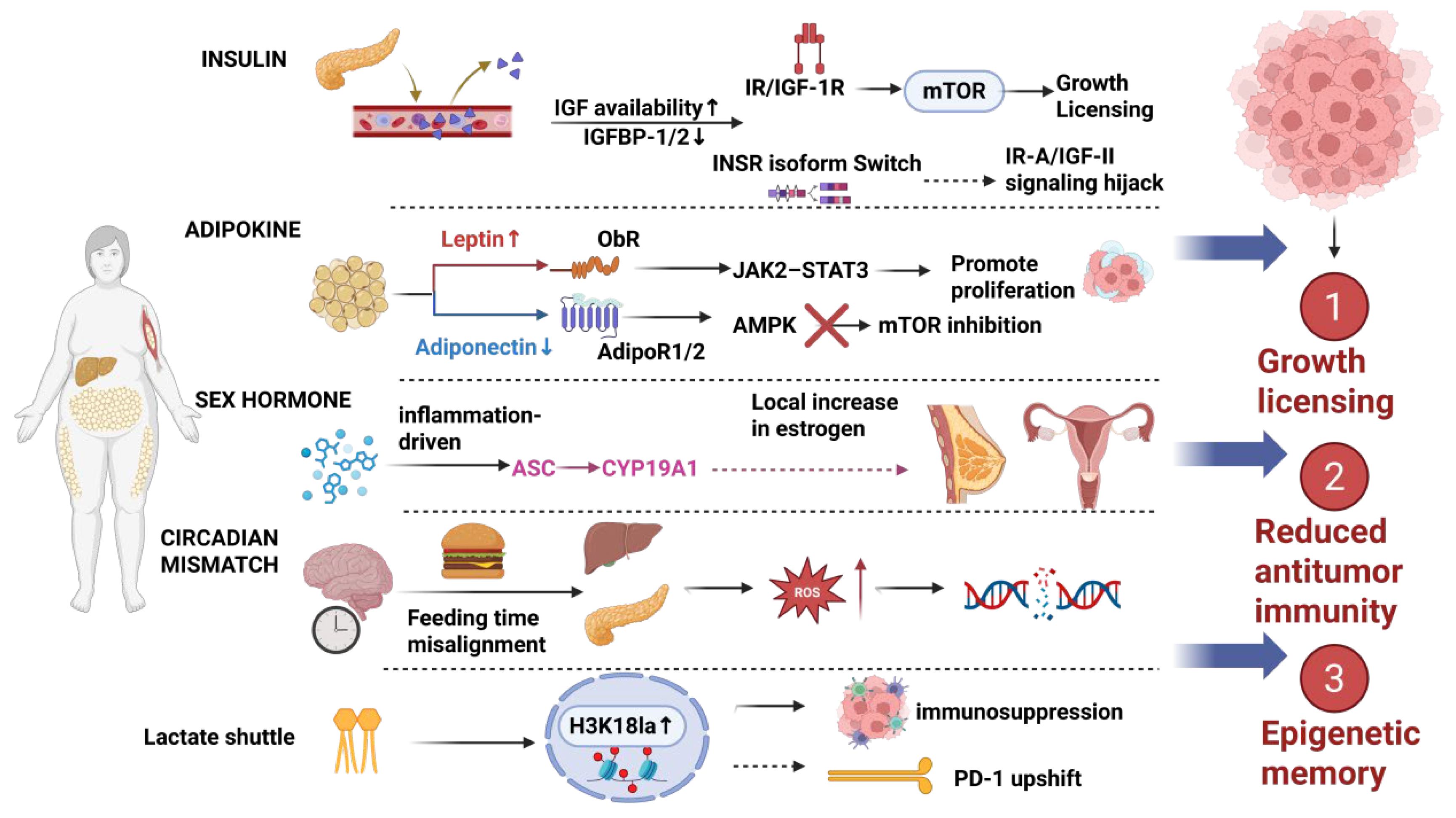 - Obesity drives tumorigenesis through coordinated metabolic, hormonal, and inflammatory remodeling that precedes and conditions tumor microenvironment (TME) barriers.