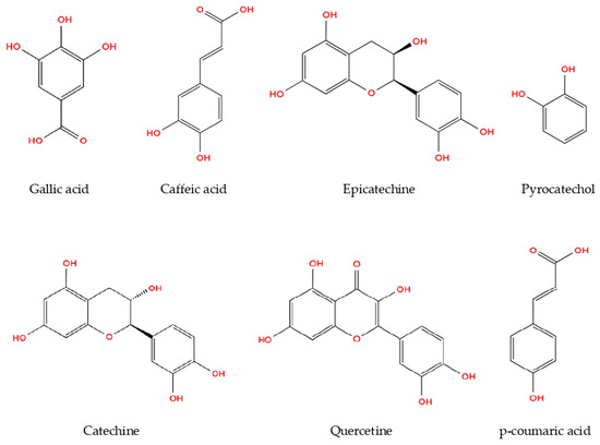 The phenolic concentrations detected in Rhizopogon extracts fall within the ranges previously reported for edible macrofungi. Gallic acid and pyrocatechol were the dominant phenolics, whereas flavonoids such as catechin, epicatechin, and quercetin were present at moderate levels. The relatively high pyrocatechol content suggests that Rhizopogon may represent a phenolic-rich fungal resource. The chemical structures of the identified phenolic compounds are depicted in Figure 2.