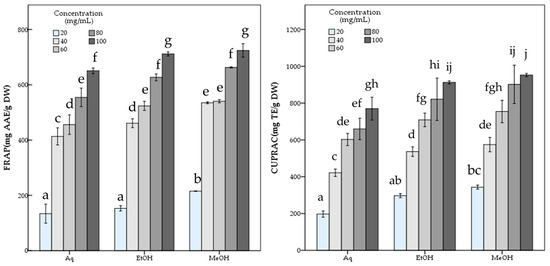 Metal ion reducing capacity of R. roseolus extracts at various concentrations. Ferric reducing antioxidant power (FRAP) (mg AAE/g DW) and Cupric reducing antioxidant capacity (CUPRAC) (mg TE/g DW). Different lowercase letters indicate a significant difference at p < 0.05.