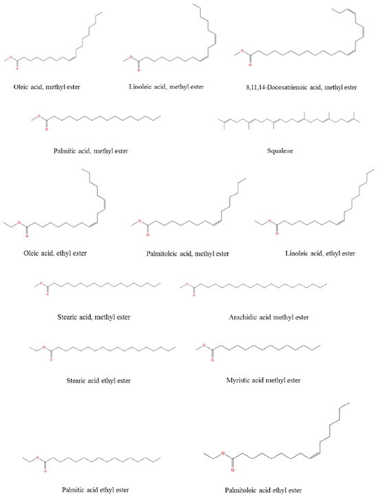 The total concentration of mono- and polyunsaturated fatty acids were found to be 79.49%. On the other hand, methyl esters of palmitic acid (6.42%, RT: 38.098) and stearic acid (3.44%, RT: 42.429) were the major saturated fatty acids determined in R. roseolus, along with arachidic acid (0.20%, RT: 46.231) and myristic acid (0.19%, RT: 32.95), and ethyl esters of palmitic acid (1.46%, RT: 39.634) and stearic acid (0.89%, RT: 43.743). The total concentration of saturated fatty acids was determined to be 12.6%. Squalene, which is a precursor triterpenoid that takes part in sterol biosynthesis, was also determined with a concentration of 6.25%. The total concentration of the identified compounds was determined as 98.34% from the fatty acid composition analysis performed by GC-MS. The total ion chromatogram (TIC) and the chemical structures of the determined fatty acids are depicted in Figure 5 and Figure 6.
