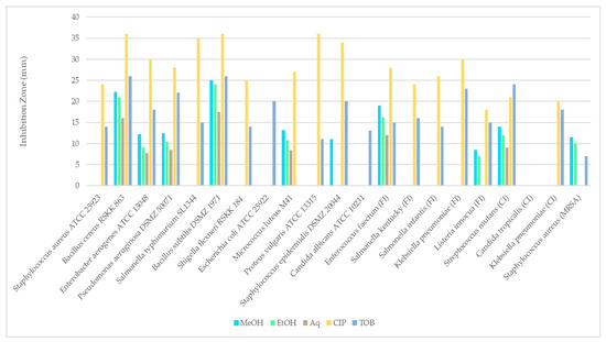 Antimicrobial activity of R. roseolus extracts (100 mg/mL) assessed by disk diffusion method.