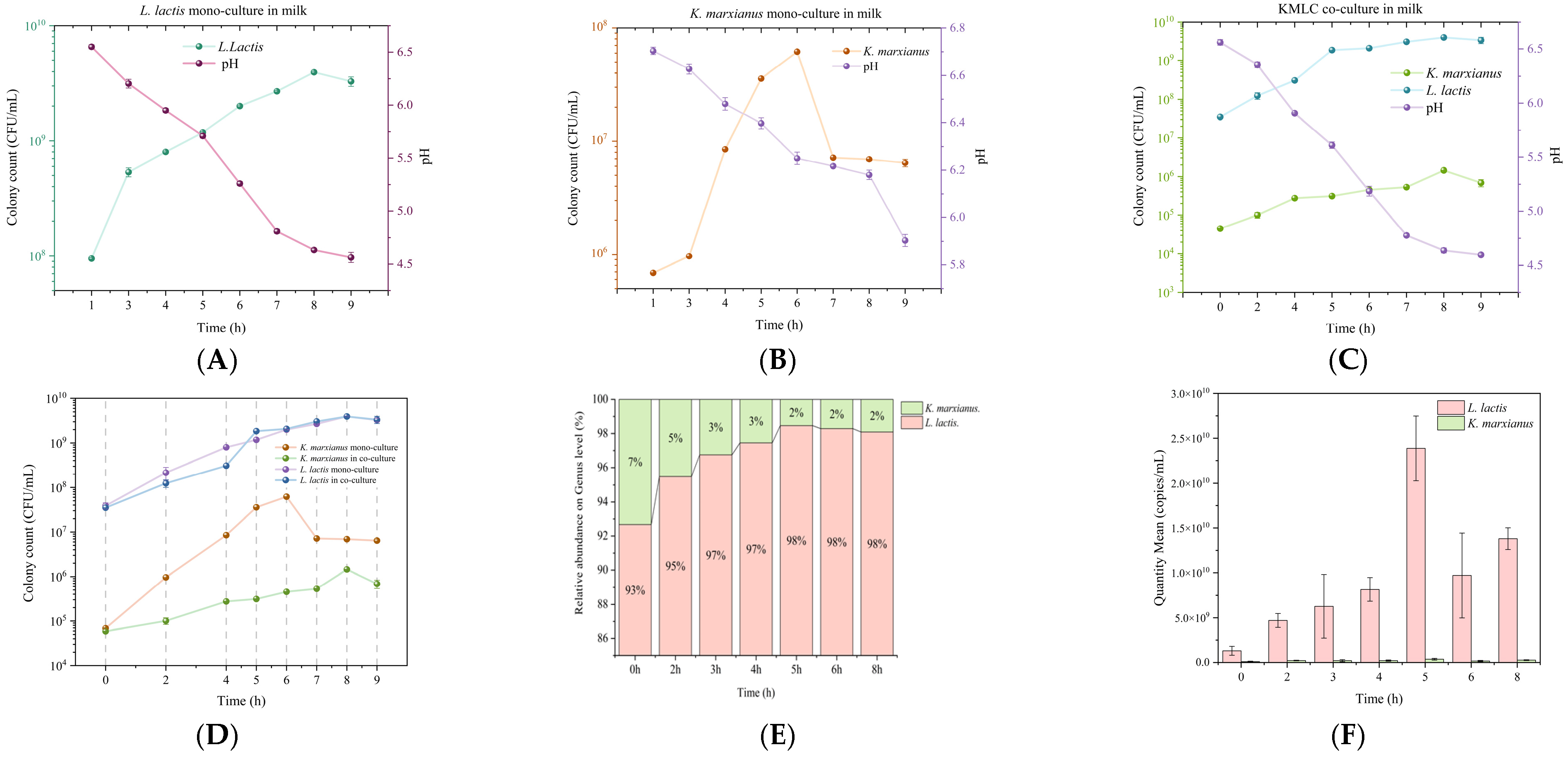- Guo, X.; Yu, L.; Liu, Y.; Xiao, M.; Zhang, C.; Zhao, J.; Chen, W.; Tian, F.; Zhai, Q. Metabolic interactions between Lactococcus lactis and commercial starter cultures enhances the quality and flavor of fermented milk. Food Res. Int. 2025, 180, 116403. [Google Scholar] [CrossRef]
