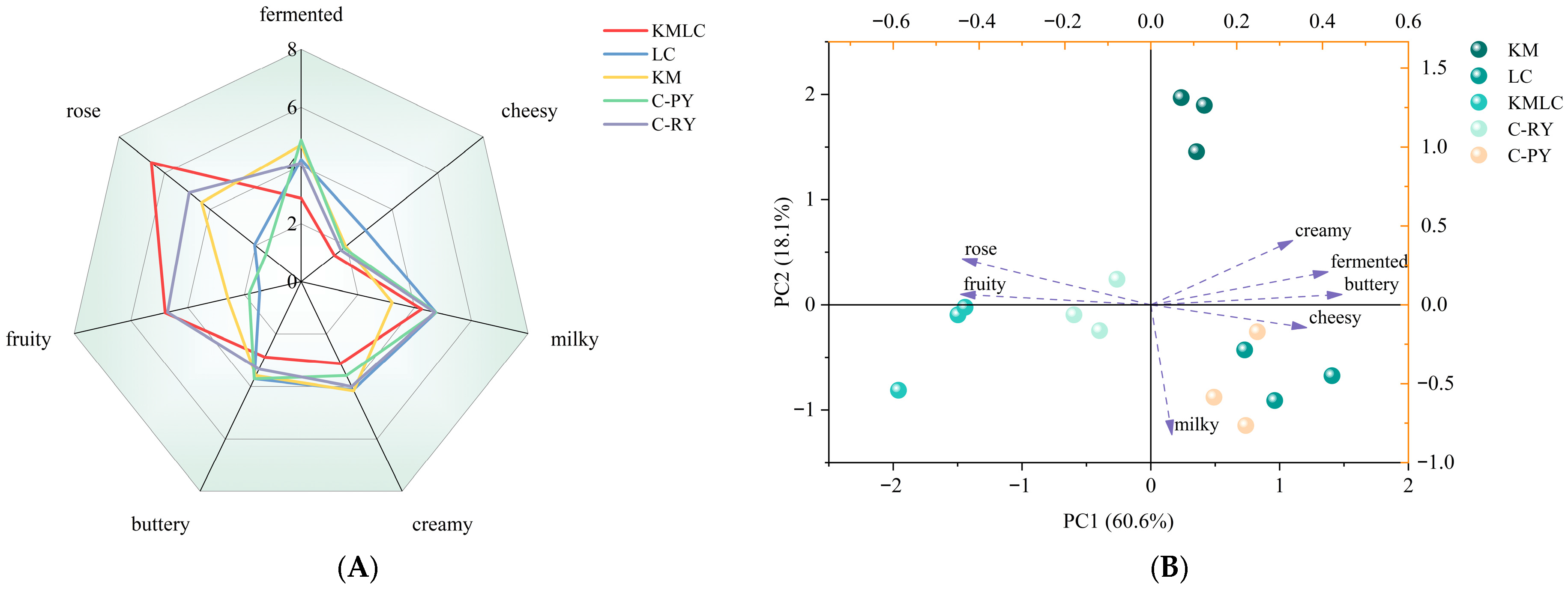 - Zhang, L.; Mi, S.; Liu, R.; Sang, Y.; Wang, X. Evaluation of volatile compounds in milks fermented using traditional starter cultures and probiotics based on odor activity value and chemometric techniques. Molecules 2020, 25, 1129. [Google Scholar] [CrossRef]