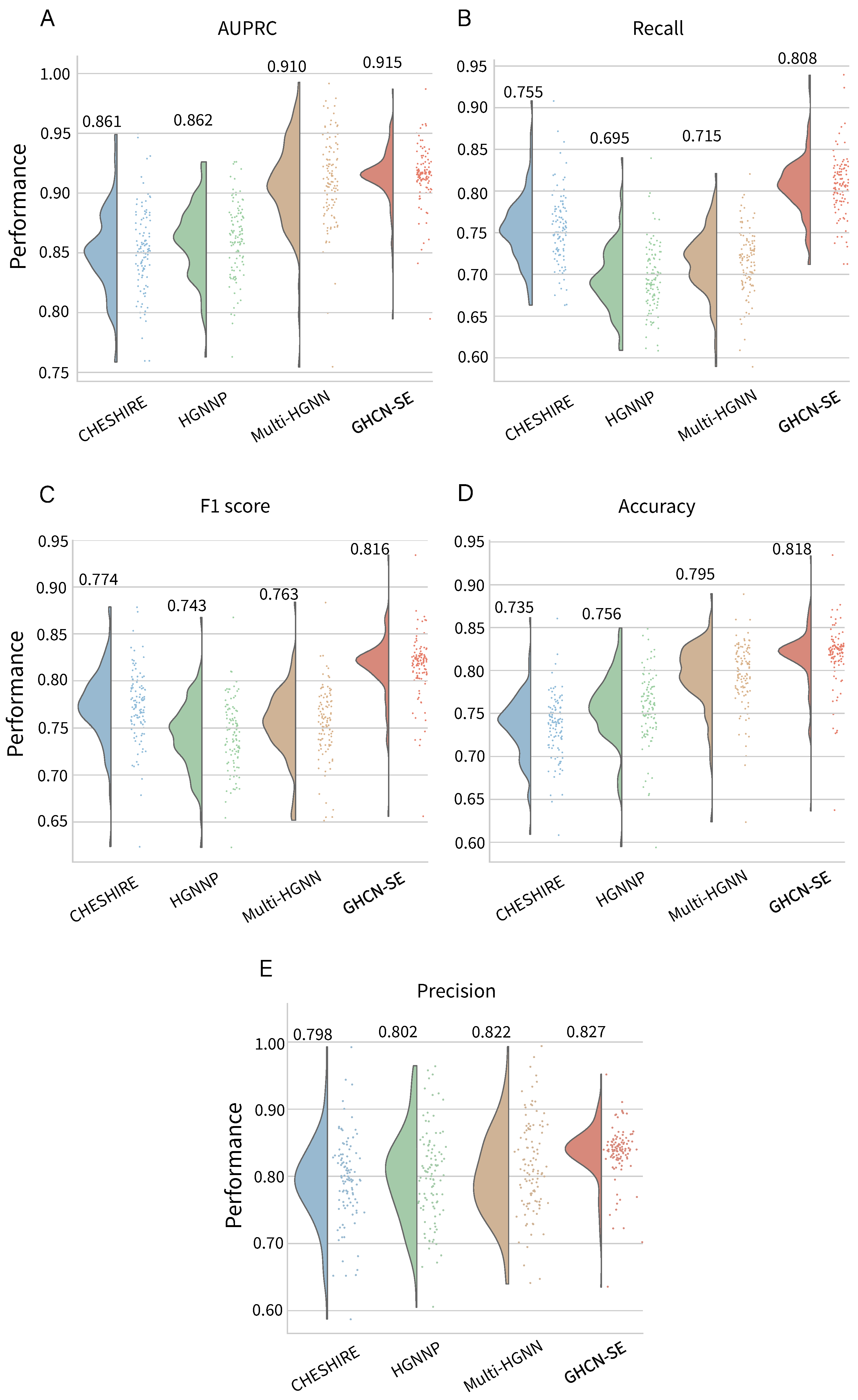 Raincloud plots and average values of reaction prediction performances on 108 BiGG GEMs for GHCN-SE and three baseline models, in terms of (A) AUPRC, (B) recall, (C) F1 score, (D) accuracy, and (E) precision.