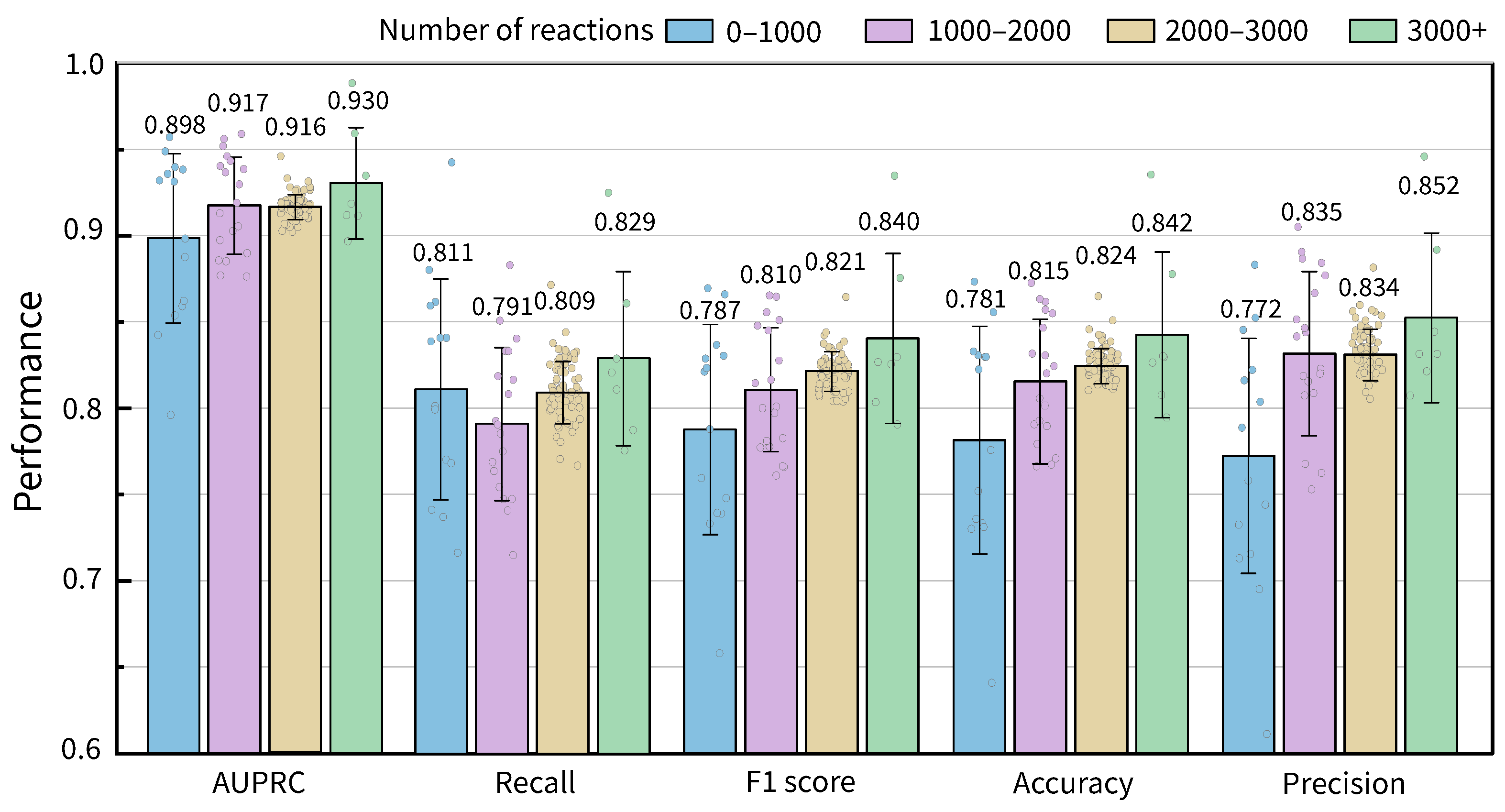Bar chart of the average values and distributions of reaction prediction performances of GHCN-SE under different network scales, with error bars representing the standard deviation.
