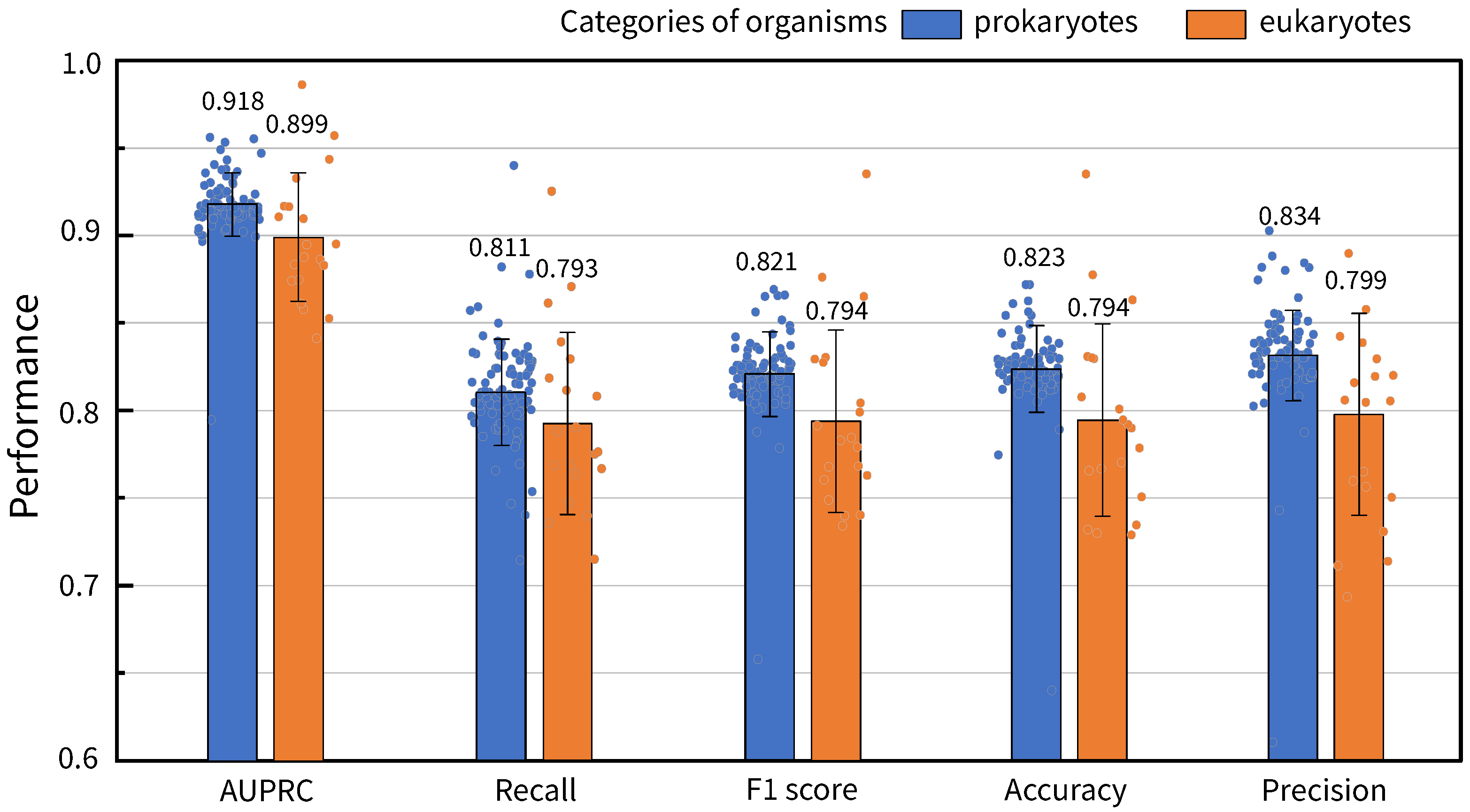 Bar chart of the average values and distributions of reaction prediction performances of GHCN-SE classified by species, with error bars representing the standard deviation.