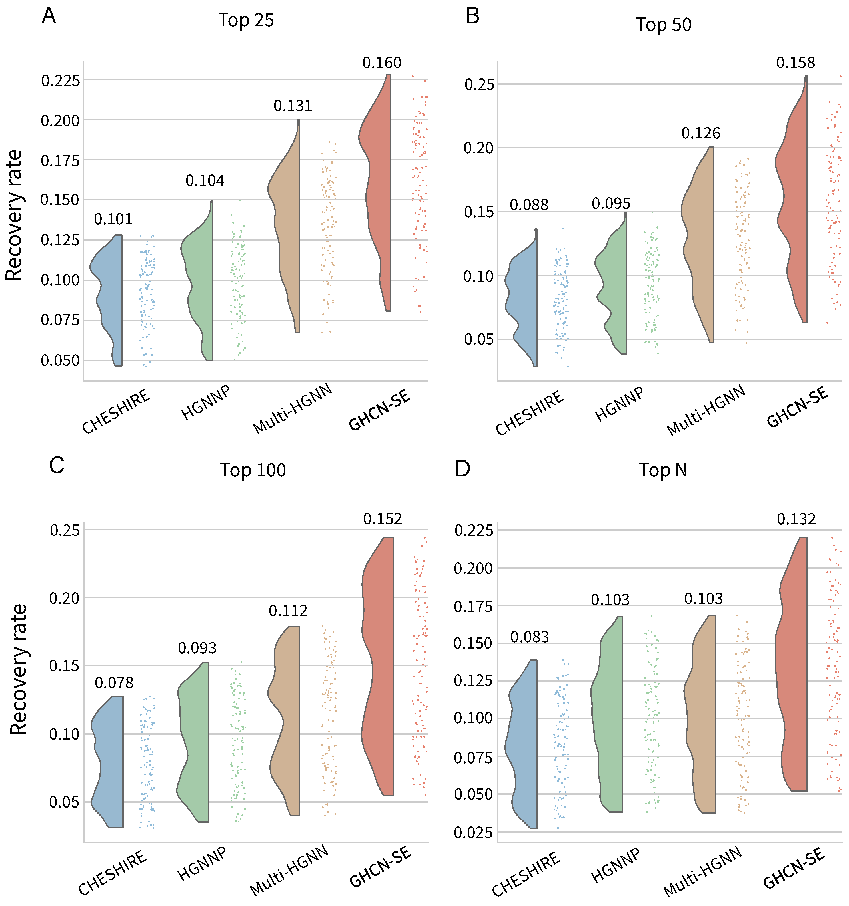 Raincloud plots and average values of reaction recovery performances on 108 BiGG GEMs for GHCN-SE and three baseline models, by selecting top 25, 50, 100, and N reactions, respectively. (A) Top 25, (B) Top 50, (C) Top 100, and (D) Top N.