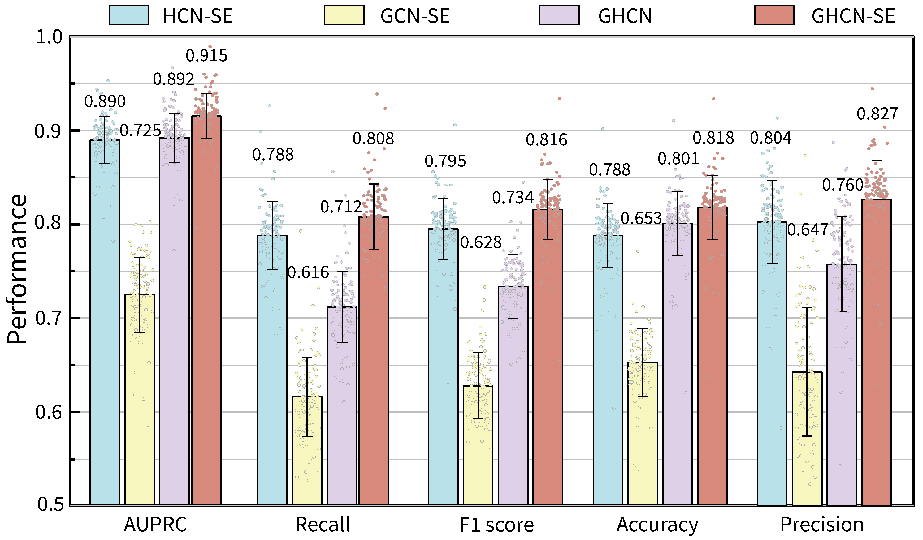 Bar chart of the average values and distributions of prediction performances of GHCN-SE and three variant approaches on 108 BiGG GEMs, with error bars representing the standard deviation.