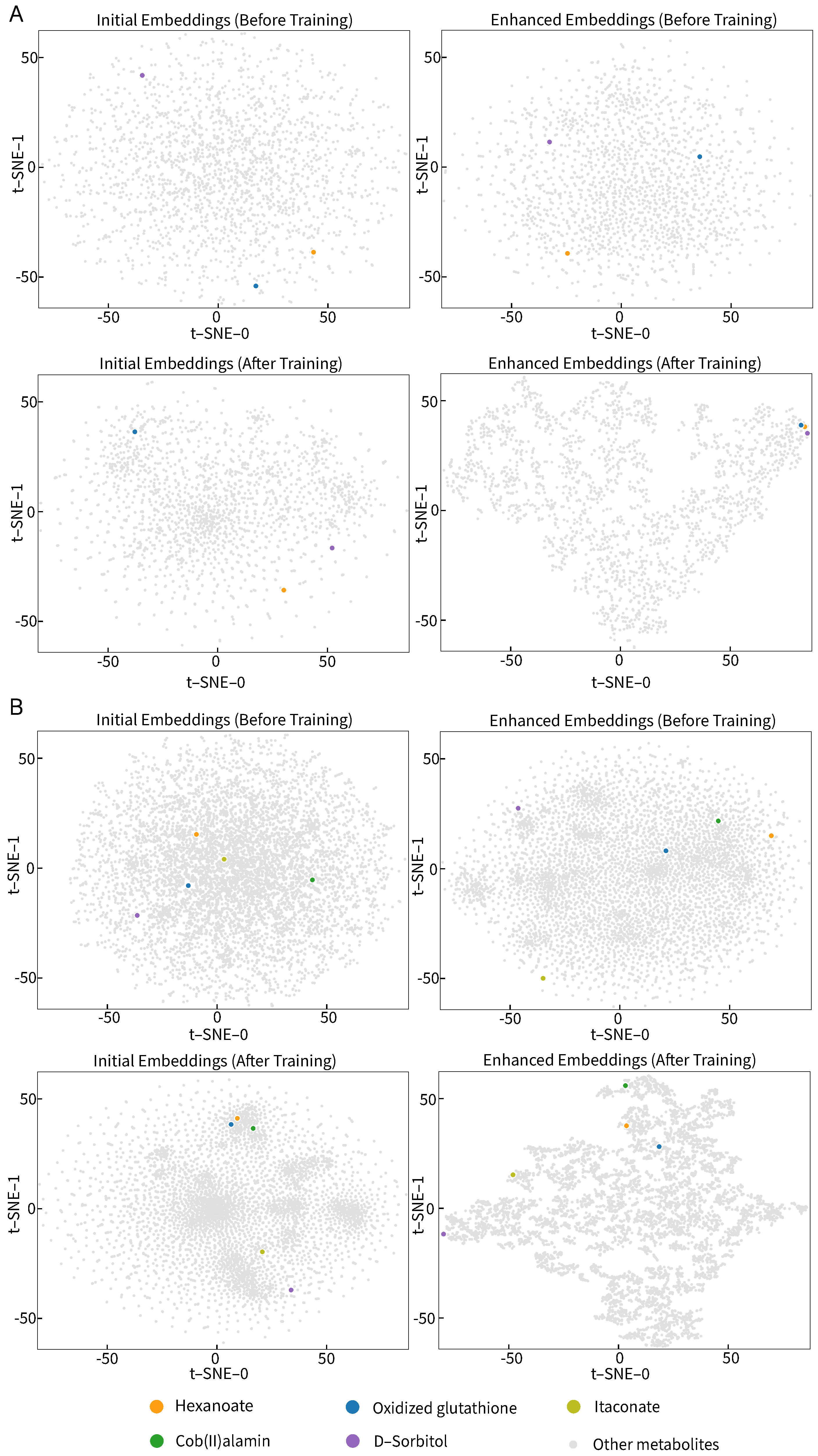 The visualization of the distributions of the initial embeddings and the enhanced embeddings before and after training using t-SNE, where the orange point denotes hexanoate, the blue point denotes oxidized glutathione, the yellow point denotes itaconate, the green point denotes cob(II)alamin, and the purple point denotes D-sorbitol. (A) iML1515, and (B) Recon3D.