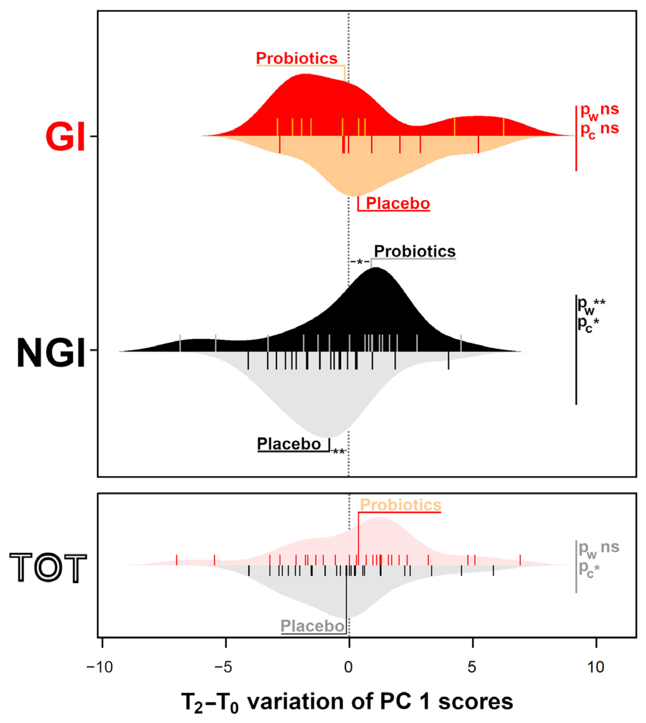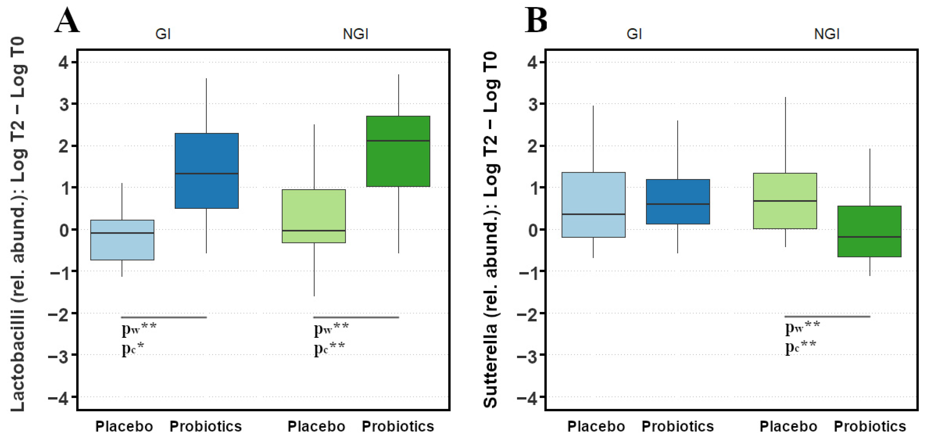 | Placebo (TOT = 21) | Probiotics (TOT = 19) | p | Placebo (TOT = 8) | Probiotics (TOT = 9) | p | |
