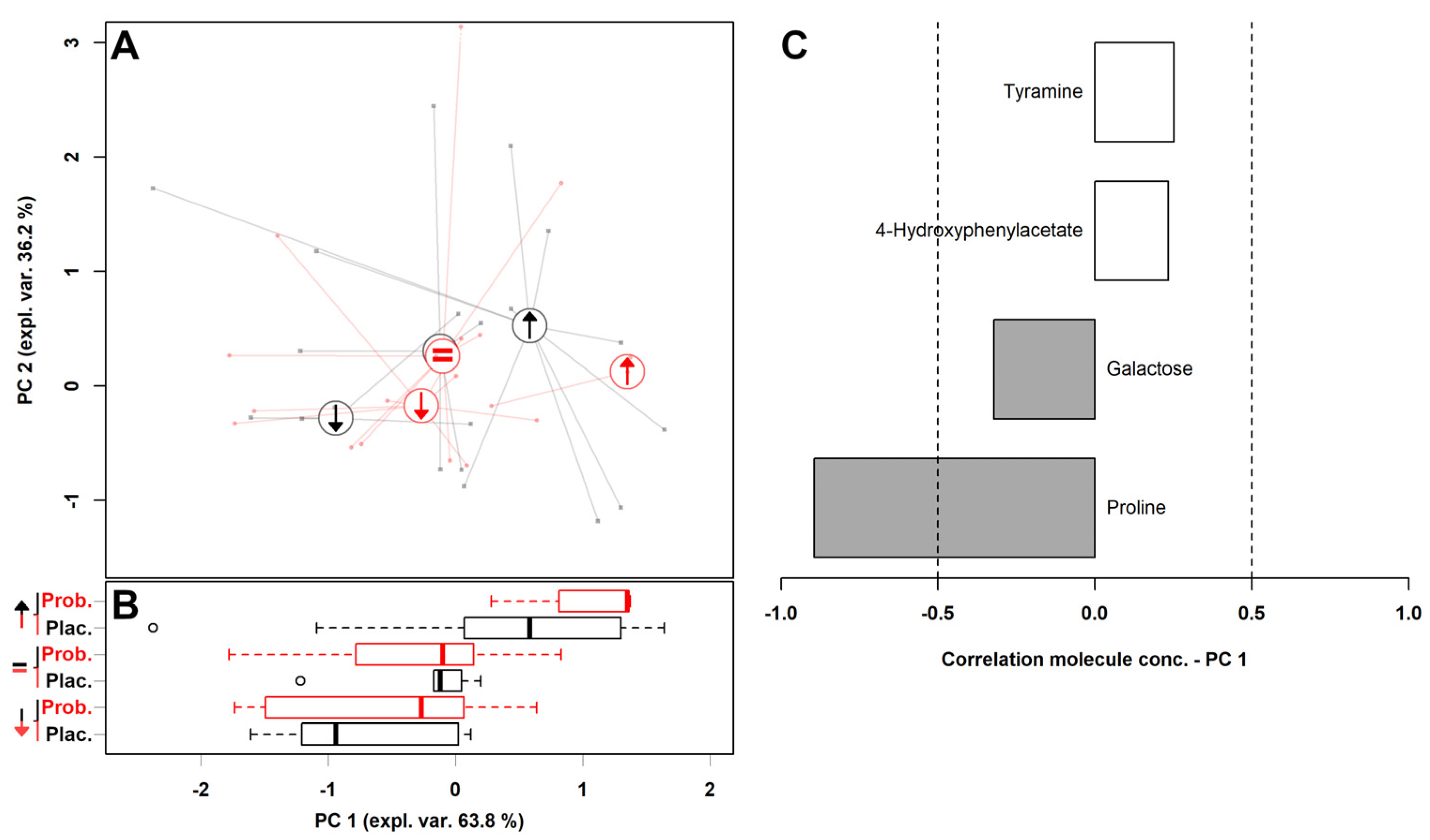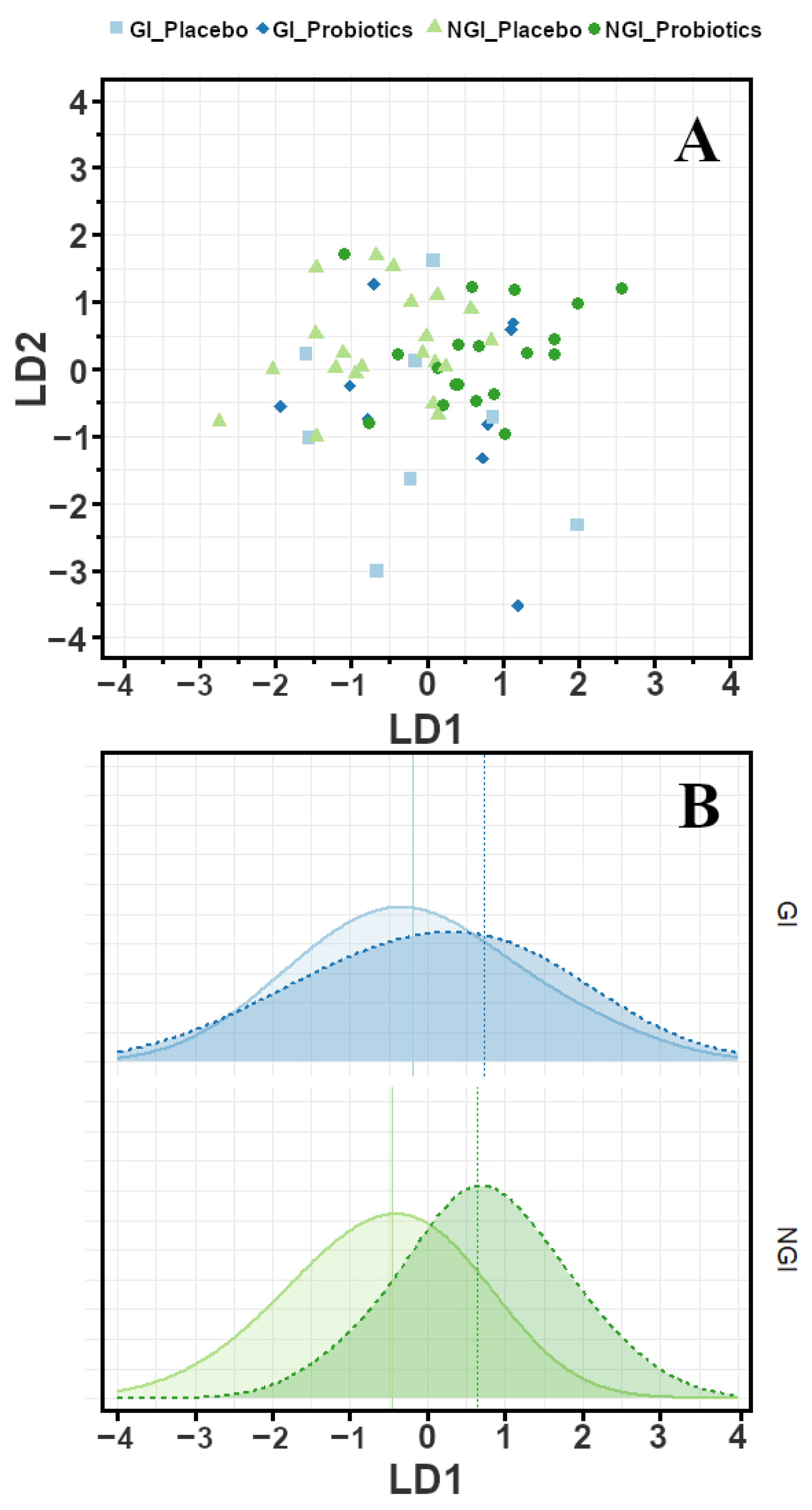 4.2. Effects of Probiotics Administration on Fecal Microbiota and Metabolome