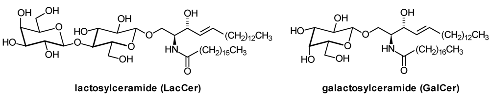 Structures of lactosylceramide and galactosylceramide. Only one of the various lipoforms is shown.