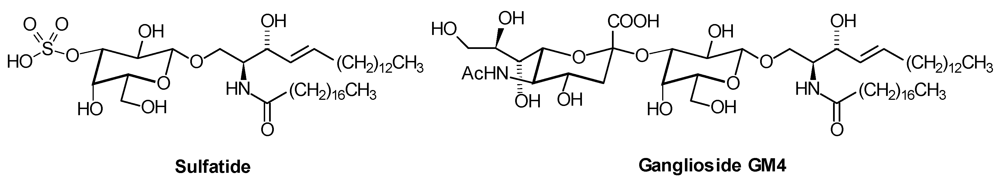 Structures of sulfatide (GalCer-3′-sulfate) and ganglioside GM4. Only one of the various lipoforms is shown. Sulfatide is the major storage substance in Metachromatic Leukodystrophy.