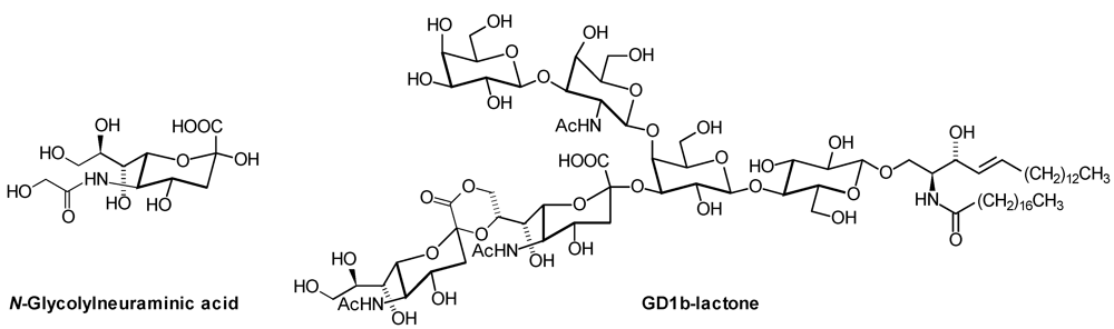 N-Glycolylneuraminic acid (Neu5Gc; α-configuration) and an example of a GD1b-lactone.