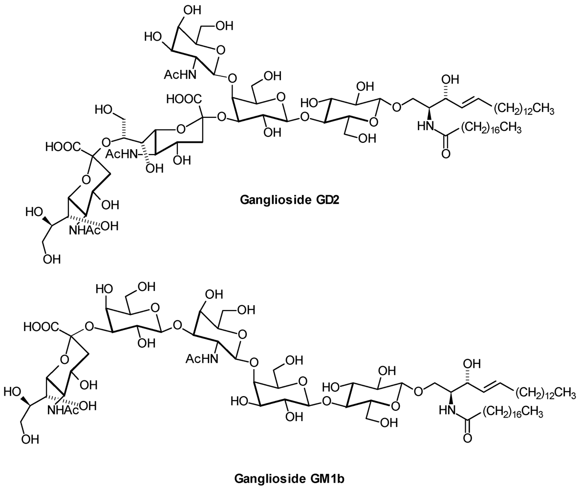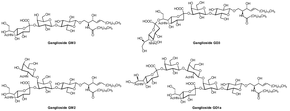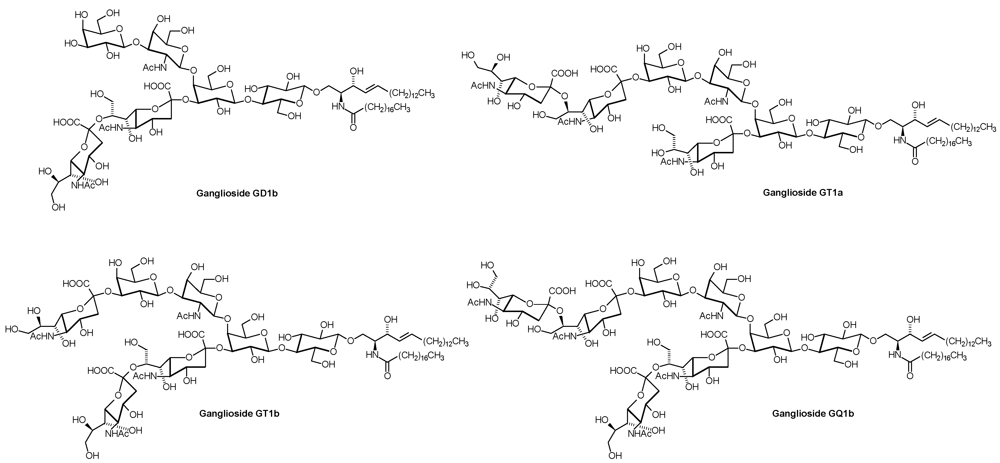 | GQ1b: | Neu5Acα2,8Neu5Acα2,3Galβ1,3GalNAcβ1,4(Neu5Acα2,8Neu5Acα2,3)Galβ1,4Glcβ1,1′Cer |