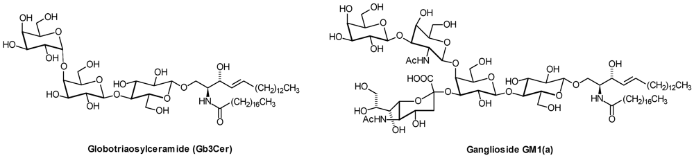 Since GSLs also interact with proteins present in the same membrane [28], including pathophysiologically relevant receptors such as that for insulin [29], methods for their determination in different biological matrices are desired in relation to associated diseases. In addition, it is assumed that GSLs are not homogeneously distributed on the cell surface, but, together with glycosylphosphatidylinositol-anchored proteins, sphingomyelin, and cholesterol, segregate into membrane domains [28]. These so-called rafts are regarded as the physiological surroundings of many membrane proteins. According to Stimulated Emission Depletion microscopy of living cells, the lifetime of rafts appears to be very short, and also the upper limit for their size seems to be only about 20 nm diameter [30]. Although methods, such as extraction by means of detergent or immunostaining used for the characterization of these transient structures, have to be critically examined [31], analysis of lateral GSL distribution should also be a focus of glycosphingolipidomics. In addition, the subcellular distribution of GSLs, which is not resolved by most of the currently applied analytical techniques, is of relevance because GSL function can depend on the cellular site: Different functional properties have been attributed to ganglioside GD3, dependent on its localization in the plasma membrane, the mitochondria, or the nucleus [32]. In the plasma membrane, GSLs play a role in infectious diseases [33] where they act as cellular receptors and co-receptors for viruses, bacteria, and microbial toxins. Examples include ganglioside GM1 as the receptor for cholera toxin, and globotriaosylceramide (Gb3Cer) as receptor for verotoxins and Shiga toxins (Figure 6).