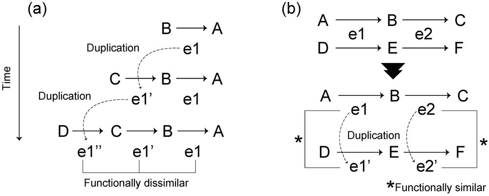 Díaz-Mejía et al. [29] and Light and Kraulis [30] investigated the contiguity of duplication pairs in the metabolic networks of Escherichia col, represented as reaction networks, using the shortest path length (defined as the number of edges in the shortest path between a node pair). In reaction networks, shortest path length indicates the minimum number of reaction steps. They found that the shortest path length between homologous pairs is smaller than that expected by chance. This result suggests that duplication pairs are neighboring in the metabolic networks, as predicted by retrograde evolution. However, the homologous pairs showed similar enzymatic functions, suggesting patchwork evolution. Since the proximity of duplication pairs with dissimilar functions in metabolic networks is more significant than that of duplication pairs with similar functions, Light and Kraulis concluded that retrograde evolution plays a limited role in metabolic pathway expansion, and that patchwork evolution is the predominant mechanism underlying metabolic pathway expansion. Díaz-Mejía et al., however, suggested that retrograde evolution and patchwork evolution might not be independent of each other because the proximity of duplication pairs is statistically significant despite functional similarity (Figure 4a). For example, the origin of 4 homologous carbon–nitrogen ligases catalyzing consecutive reactions in peptidoglycan biosynthesis is consistent with both retrograde and patchwork evolution [30].