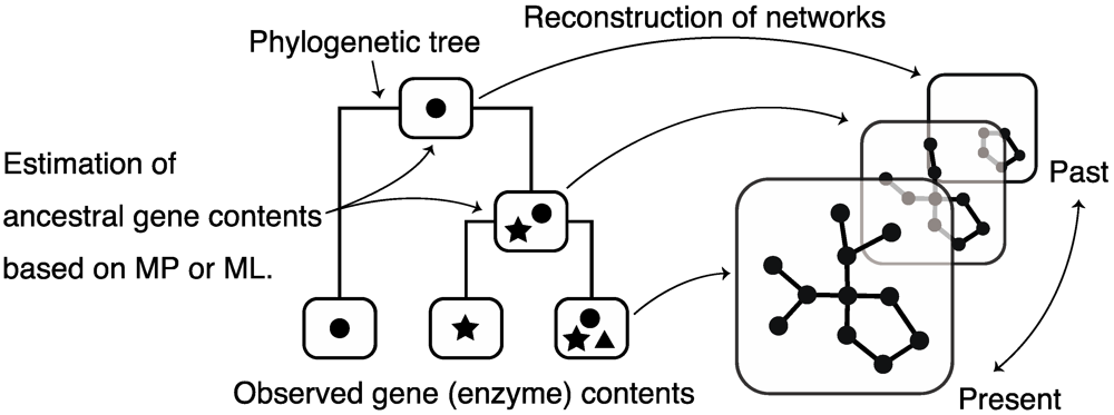 Large-scale data on metabolic networks are available in several databases; however, data regarding ancestral metabolic networks are unavailable. Therefore, there have been attempts to reconstruct (estimate) ancestral metabolic networks using observed (current) metabolic information (i.e., gene contents) and phylogenetic profiles (mainly, phylogenetic trees). Reconstruction of ancestral networks is a powerful tool for understanding metabolic network formation by tracing it. These estimation methods are divided into 2 major types.