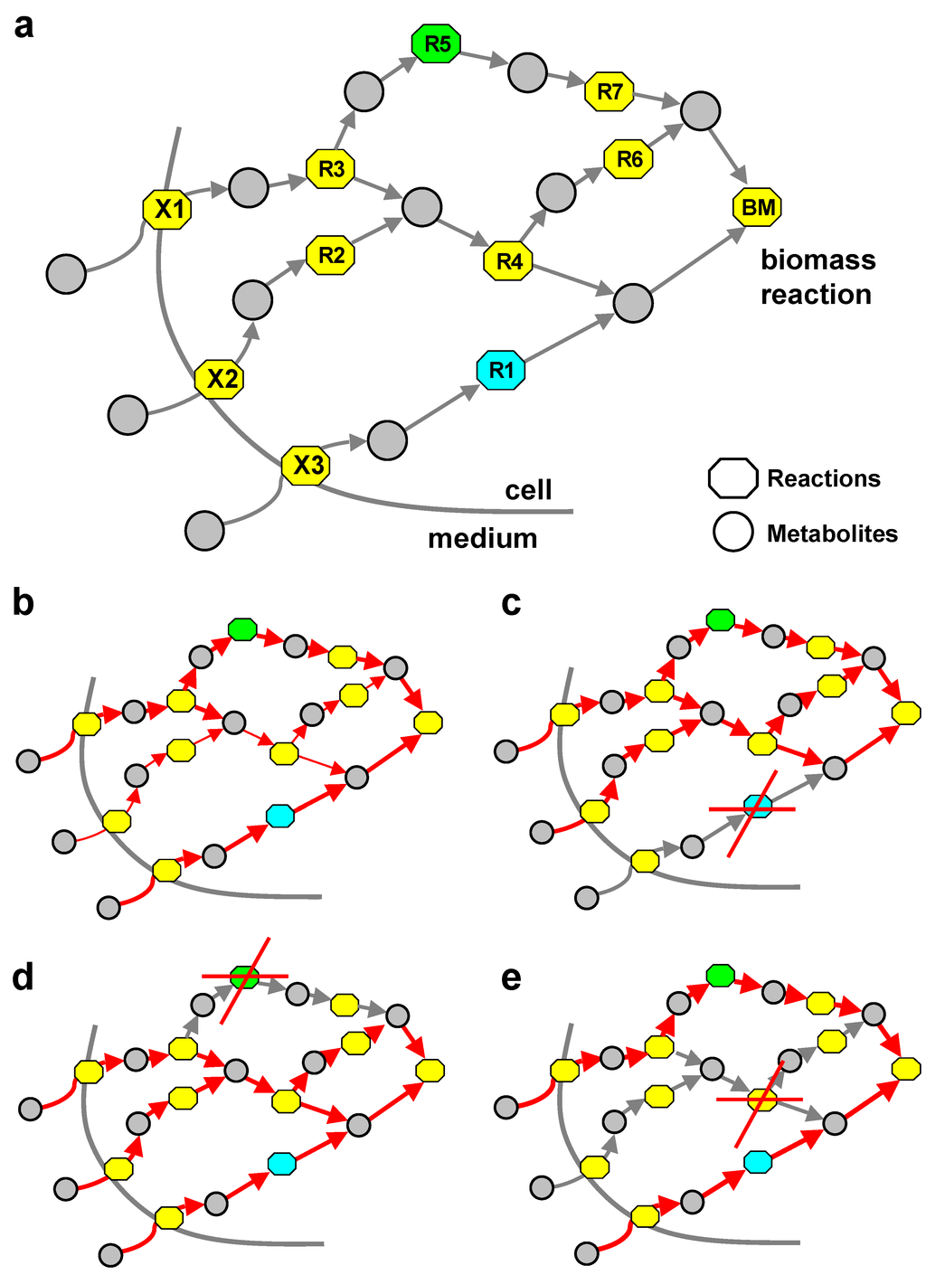 Figure 1a shows a schematic representation of metabolism with three exchange reactions (X1, X2 and X3) with the environment and a two-component biomass reaction (BM). Circles represent metabolites, while boxes stand for reactions in this bipartite graph view of a metabolic system. In this Figure, R1 (highlighted in blue) is an example of an SA reaction, as it represents one of the shortest paths to BM, while R5 (highlighted in green) is consuming and producing only metabolites, which are uniquely produced (UP) and uniquely consumed (UC), and thus is an example of a UPUC reaction. Figure 1b–e provides a qualitative impression of the wild-type flux distribution (Figure 1b) and the re-routing of fluxes upon R1 and R5 knockout (Figure 1c,e), respectively.