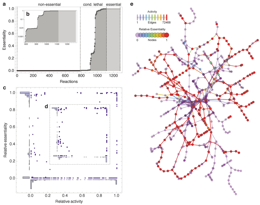 Outcome of combinatorial minimal media simulations. (a) Sorted relative essentiality profile determined by the simulation of reaction deletions under 72468 combinatorial minimal media conditions. The three different essentiality classes are indicated by dashed lines. Inset (b) shows the same profile using semilog plot. (c) No relation is observed between essentiality and activity (non-essential reactions have been removed in inset (d); relative activity is the number of simulations that a reaction was active normalized by the total number of simulations). (e) A reaction-centric network diagram illustrating the relative essentiality on the nodes (707 reactions) and co-occurring activity on the edges of the cytoplasmic part of the iAF1260 model (transport, periplasmic, and blocked reactions have been discarded; currency metabolite have been removed manually, see Methods).