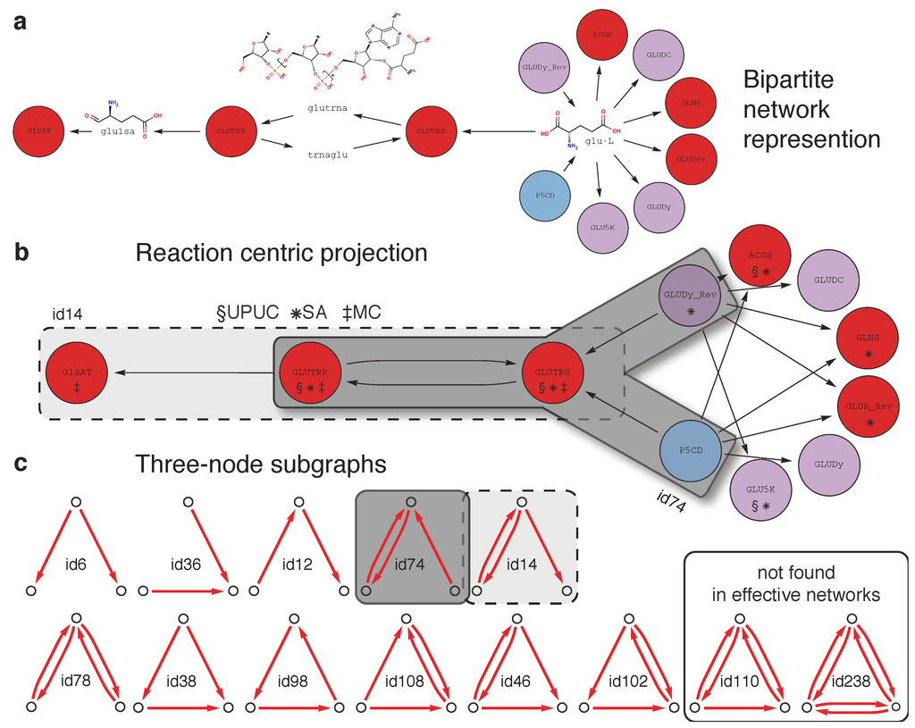 (a) Bipartite network representation of the two step conversion of L-glutamate (glu-l) into L-glutamate-1-semialdehyde (glu1sa) involving glutamyl-tRNAsynthetase (GLUTRS; 6.1.1.17) and glutamyl-tRNA reductase (GLUTRR; 1.2.1.-). Additionally, two reaction sources for L-glutamate, Δ1-pyrroline-5-carboxylate dehydrogenase (P5CD; 1.5.1.12) and the reverse direction of glutamate dehydrogenase (GLUDy_Rev; 1.4.1.4), and one sink for L-glutamate-1-semialdehyde, glutamate-1-semialdehyde aminotransferase (G1SAT; 5.4.3.8), are shown, among other reactions consuming L-glutamate. Node colors indicate relative essentiality (legend provided in Figure 2). (b) A reaction centric projection of the bipartite network in (a). Reaction categories (UPUC, SA, and MC) are shown for each reaction node and gray boxes indicate the occurrence of one subgraph of type id14 and two subgraphs of type id74 (see c). (c) All (13) combinatorial three-node subgraphs and corresponding identifiers (id110 and id238 have not been encountered in any effective network).