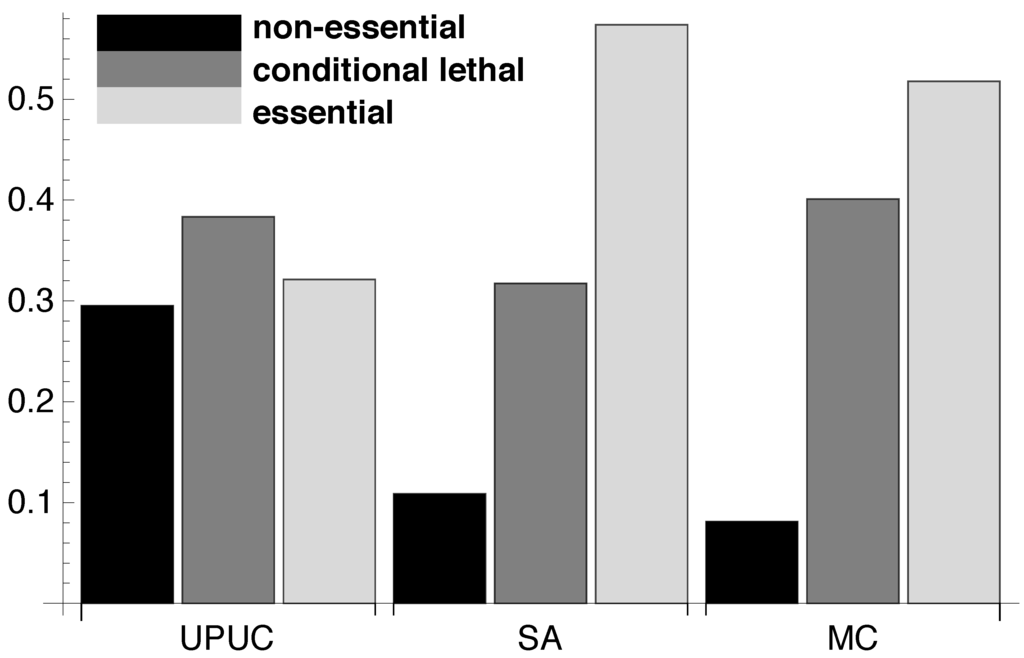 Using the relative essentiality profile (see Figure 2), we determine the amount of reactions belonging to the three essentiality classes for each of the three reaction categories. The results in Figure 4 show that the three categories incorporate different amounts of reactions belonging to each of the three essentiality classes. The SA reaction set seems to be composed of a mixture of conditional lethal and essential reactions whereas the UPUC reactions exhibit a high amount of non-essential reactions. As already mentioned, in contrast to previous findings ([21], see previous Section 2.1), the MC is not exclusively composed of essential reactions, but rather shows a similar essentiality class composition as the SA category.