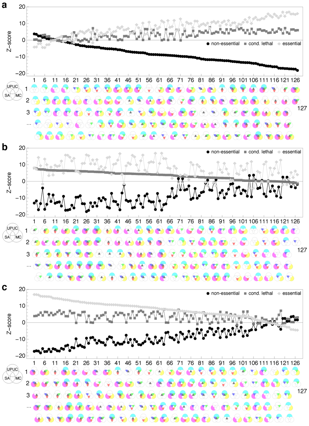 Enrichment of combinatorial reaction category sets for essentiality classes. Combinatorial sets sorted on the basis of (a) non-essential, (b) conditional lethal and (c) essential class enrichment. Venn diagrams [34] on the abscissa indicate each of the 127 nonempty unions and intersections of UPUC (upper circle), SA (lower left circle) and MC (lower right circle), respectively (no set includes less than 13 reactions, the largest combinatorial set includes 332 reactions). For the computation of Z-scores, random distribution of essentiality classes among the Venn intersections and unions was used as the underlying null hypothesis.