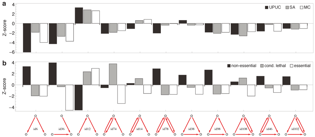 Enrichment on three-node subgraphs. The statistical over- and under-representation of (a) reaction categories and (b) essentiality classes on all occurring three-node subgraphs (two motifs have been omitted as they were not detected in any effective network). For the computation of Z-scores, random distribution of reaction categories and essentiality classes among subgraphs was used as underlying null hypothesis.