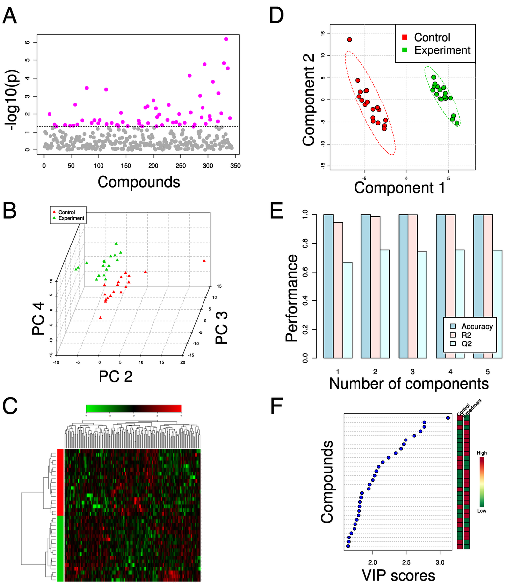 Examples of data analysis techniques for metabolomics. The effects of glucose deprivation on a cancer cell line were measured with GC-MS and analyzed in MetaboAnalyst [78] (unpublished data). (a) Pairwise t-tests of metabolites identify statistical significance of differences in individual compounds between control and experiment. The dotted line indicates p < 0.05 (no multiple hypotheses testing corrections). (b) PCA score plot reveals separation between control and experiment samples in components 2, 3, and 4. Component 1 (not shown) corresponds to analytical batch separation. (c) HCA (Ward method, Pearson’s correlation) and heatmap using the 150 most significant compounds as determined by t-test. Compounds along top, samples along left side. (d) PLS-DA score plot shows separation achieved using components 1 and 2. Dashed circles indicate the 95% confidence interval for each class. (e) Leave-one-out cross-validation shows that the majority of the predictive capacity is derived from the first two PLS-DA components. R2 and Q2 denote, respectively, the goodness of fit and goodness of prediction statistics. (f) Contribution of individual compounds to PLS-DA component 1. The 30 most important compounds and their relative abundance in control and experiment are shown, sorted by the Variable Importance in the Projection (VIP) [91] for the first component.